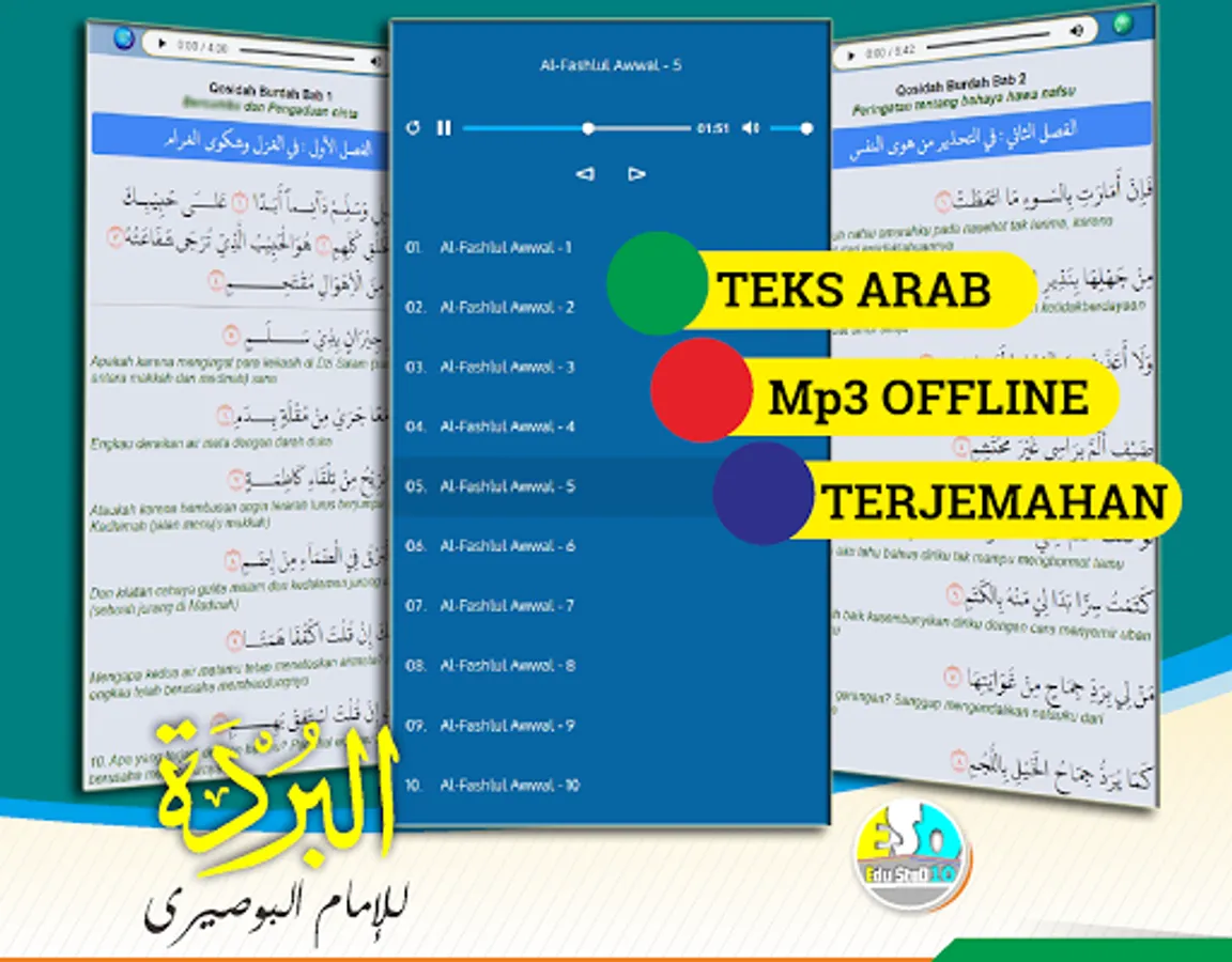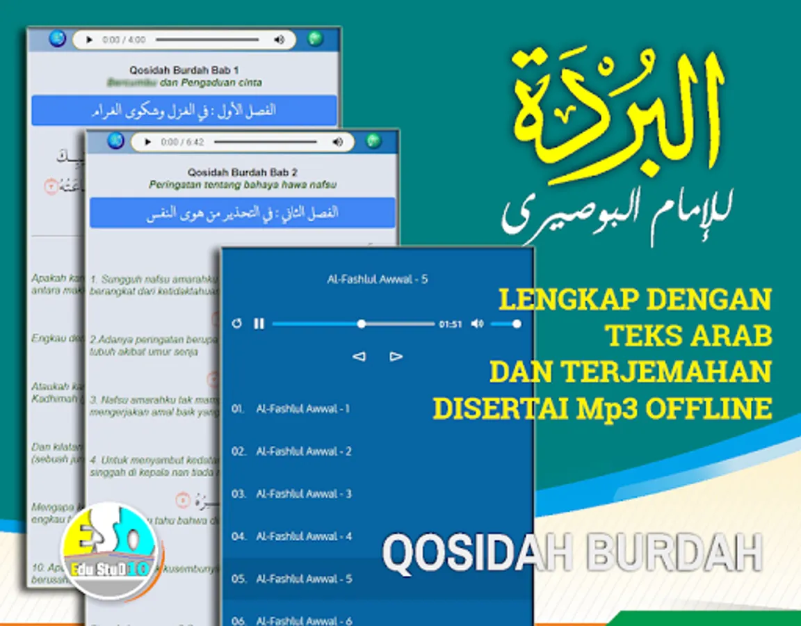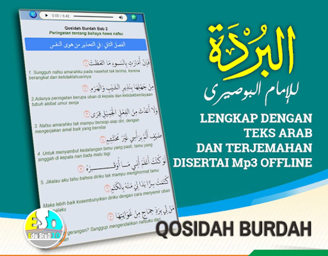 The complete Qosidah burdah and its translation is an app featuring burdah mp3, burdah pdf arabic (qasidah burdah pdf), with Arabic text and translation.