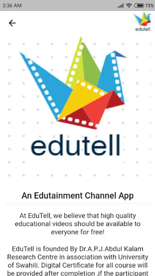 EduTell is founded By Dr.A.P.J.Abdul Kalam Research Centre in association with University of Swahili. Digital Certificate for all course will be provided after completion ,if the participant completes an online examination successfully.