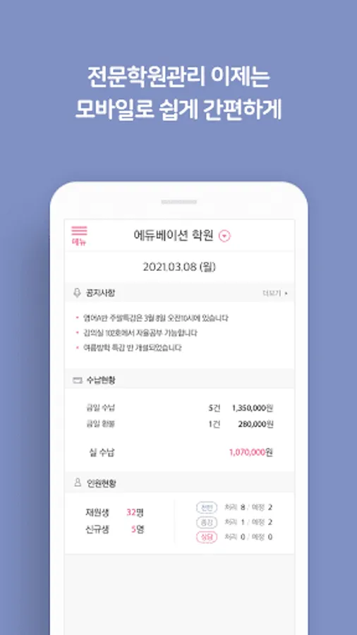 3. Systematic school management is possible through monthly check-in/discharge/attendance status inquiry and daily check-in/discharge/refund management.