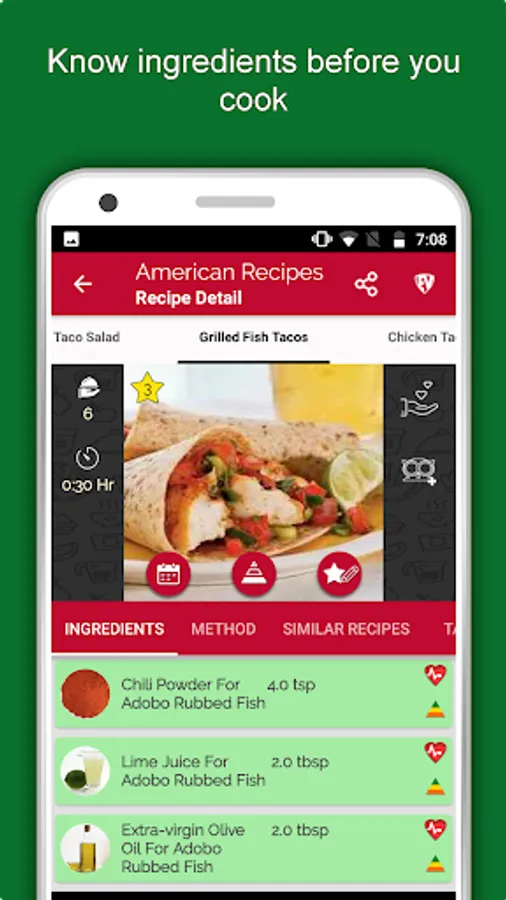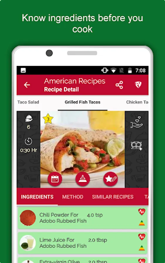 American Recipes is an app to explore the savory and tangy food from the land of America. Snack on recipes like burgers, hot dogs, pies, pancakes and more. Stimulate your taste buds and learn how to cook delicious American Food in an easy, step by step way and also know the servings. Learn about the American Cuisine and their eating etiquette.
