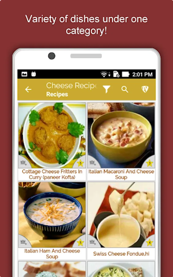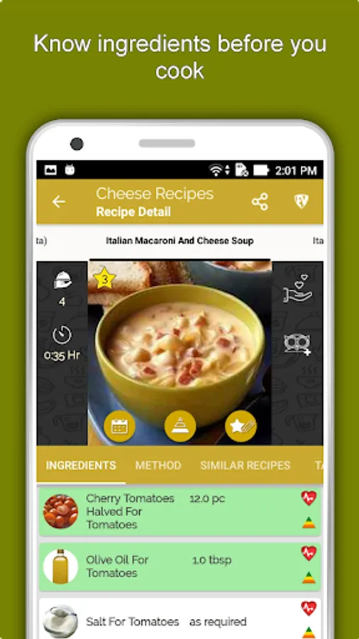 Healthy Cheese Recipes is an app to explore all types of Cheese Recipes. Find the recipes with varieties of cheese such as Feta, Mozzarella, Cheddar, Gouda and many more. Stimulate your taste buds and learn how to cook delicious Cheese Pasta, Pizzas and cheesecakes in an easy, step by step way! Cook yummy recipes in the correct pan and also know the servings.