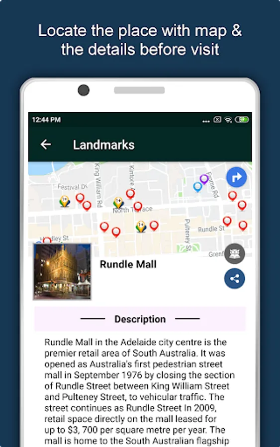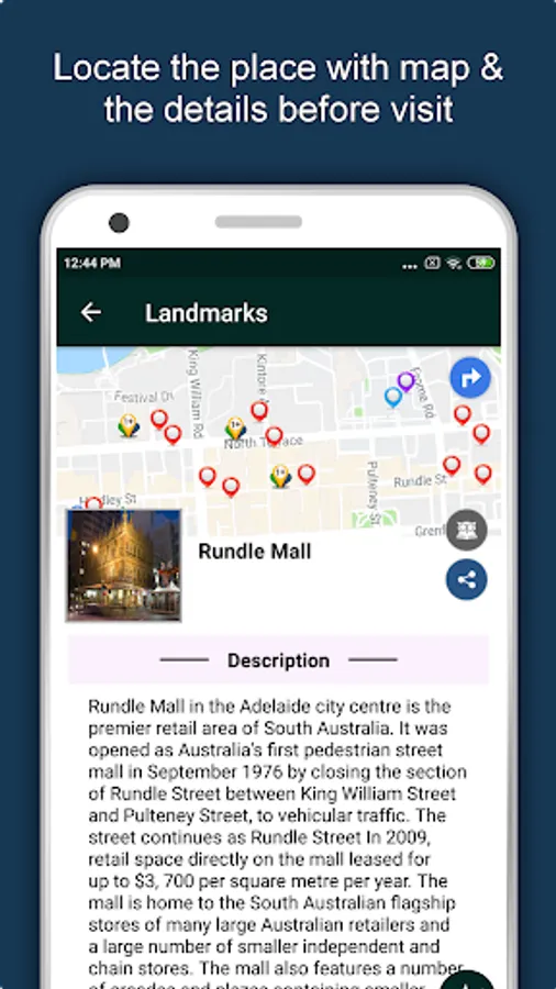 Apart from this, Adelaide Travel & Explore guides you Why, When and How to visit various places in Adelaide with precise location on the detailed Map. There are two ways to explore this app - Category view and EduBank favorite places view. Pin your destinations and get the routes on the Map. Not only this, you can see exactly how the places look like with Street View integrated in this app. The app also has a feature to Rate and write Review/Experience regarding entity(s) through Login. Your Travel experience and rating will help the user community.