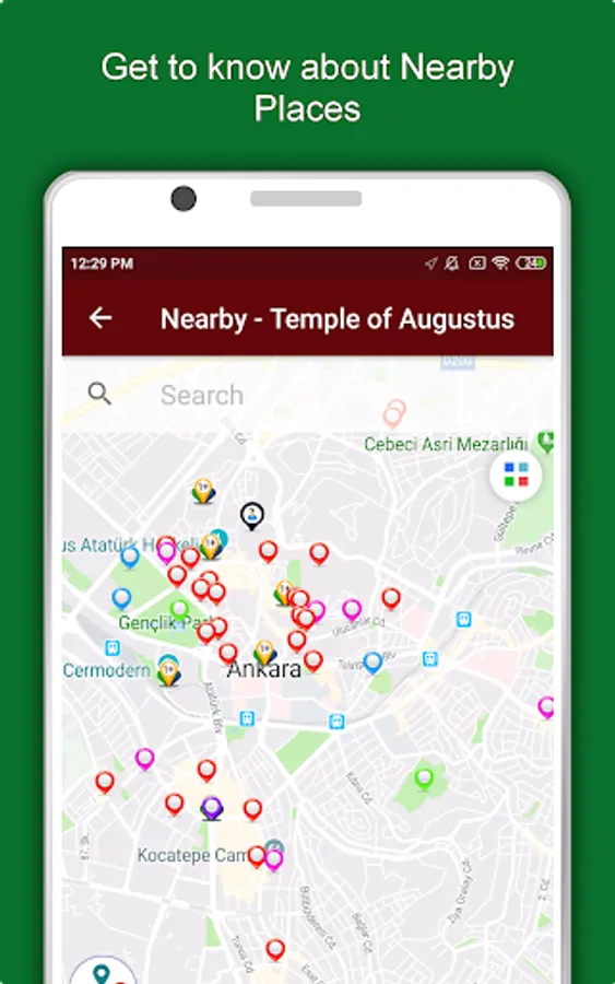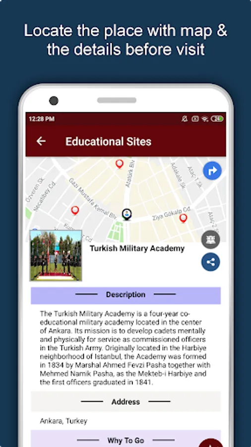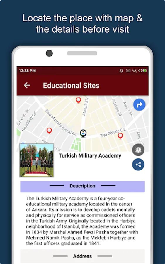 Apart from this, Ankara Travel & Explore guides you Why, When and How to visit various places in Ankara with precise location on the detailed Map. There are two ways to explore this app - Category view and EduBank favorite places view. Pin your destinations and get the routes on the Map. Not only this, you can see exactly how the places look like with Street View integrated in this app. The app also has a feature to Rate and write Review/Experience regarding entity(s) through Login. Your Travel experience and rating will help the user community.