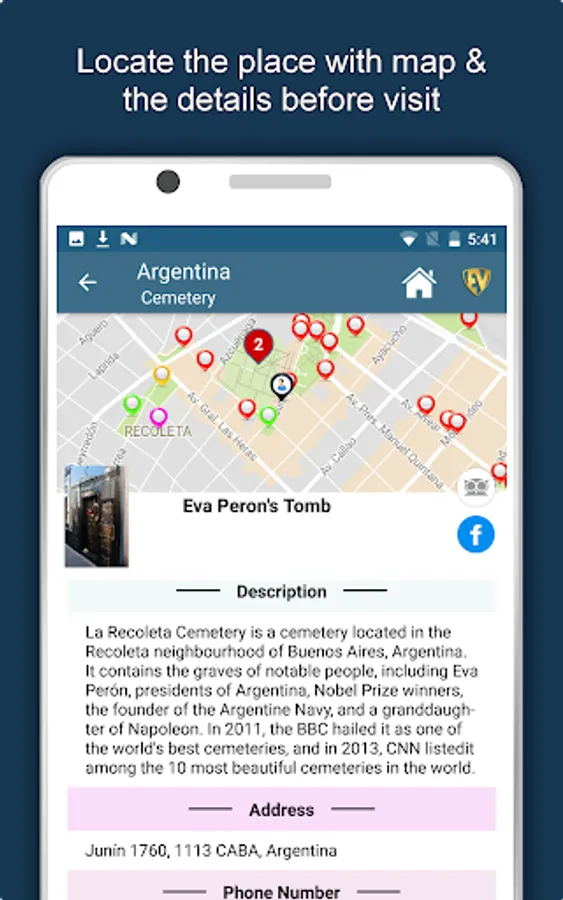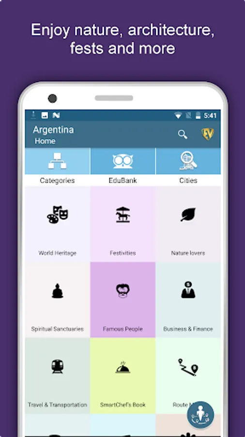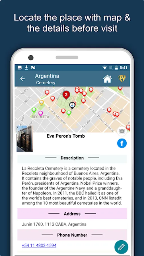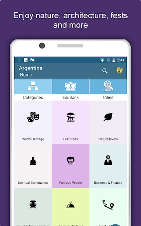 Apart from this, Argentina Travel & Explore guides you Why, When and How to visit various places in Argentina with precise location on the detailed Map. There are three ways to explore this app - Category view, City view and EduBank favorite places view. Pin your destinations and get the routes on the Map. Not only this, you can see exactly how the places look like with Street View integrated in this app. The app also has a feature to Rate and write Review/Experience regarding entity(s) through Facebook Login. Your Travel experience and rating will help the user community.