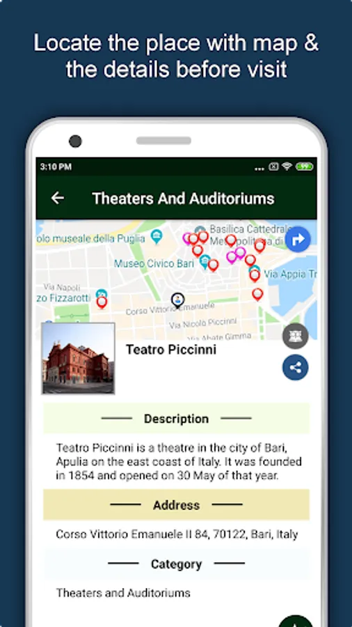 Apart from this, Bari Travel & Explore guides you Why, When and How to visit various places in Bari with precise location on the detailed Map. There are two ways to explore this app - Category view and EduBank favorite places view. Pin your destinations and get the routes on the Map. Not only this, you can see exactly how the places look like with Street View integrated in this app. The app also has a feature to Rate and write Review/Experience regarding entity(s) through Login. Your Travel experience and rating will help the user community.