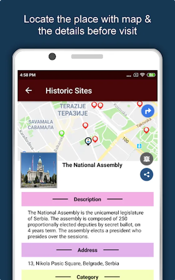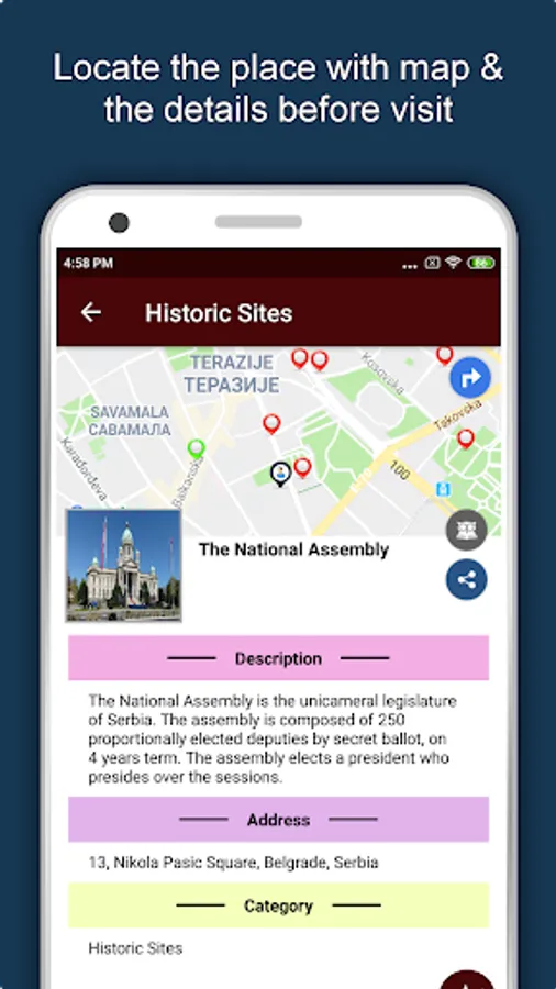 Apart from this, Belgrade Travel & Explore guides you Why, When and How to visit various places in Belgrade with precise location on the detailed Map. There are two ways to explore this app - Category view and EduBank favorite places view. Pin your destinations and get the routes on the Map. Not only this, you can see exactly how the places look like with Street View integrated in this app. The app also has a feature to Rate and write Review/Experience regarding entity(s) through Login. Your Travel experience and rating will help the user community.