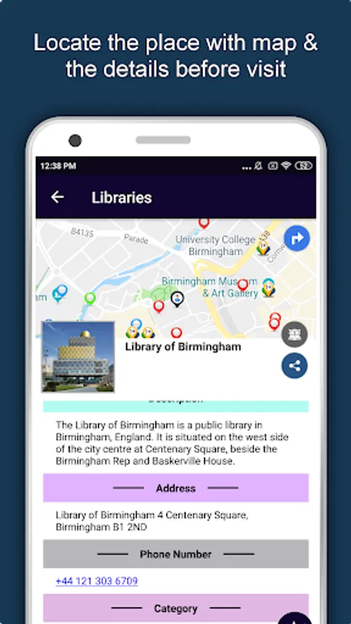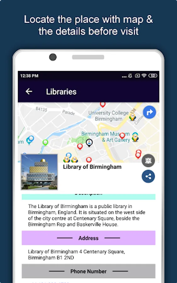 Apart from this, Birmingham Travel & Explore guides you Why, When and How to visit various places in Birmingham with precise location on the detailed Map. There are two ways to explore this app - Category view and EduBank favorite places view. Pin your destinations and get the routes on the Map. Not only this, you can see exactly how the places look like with Street View integrated in this app. The app also has a feature to Rate and write Review/Experience regarding entity(s) through Login. Your Travel experience and rating will help the user community.