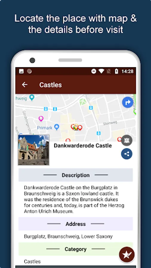 Apart from this, Braunschweig Travel & Explore guides you Why, When and How to visit various places in Braunschweig with precise location on the detailed Map. There are two ways to explore this app - Category view and EduBank favorite places view. Pin your destinations and get the routes on the Map. Not only this, you can see exactly how the places look like with Street View integrated in this app. The app also has a feature to Rate and write Review/Experience regarding entity(s) through Login. Your Travel experience and rating will help the user community.