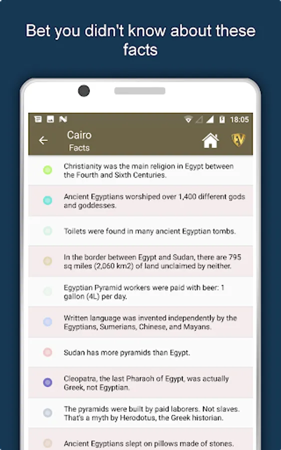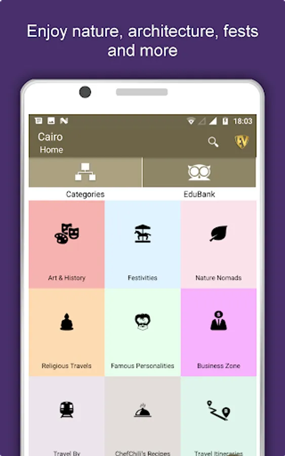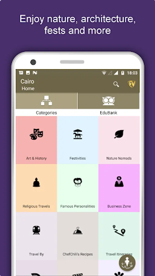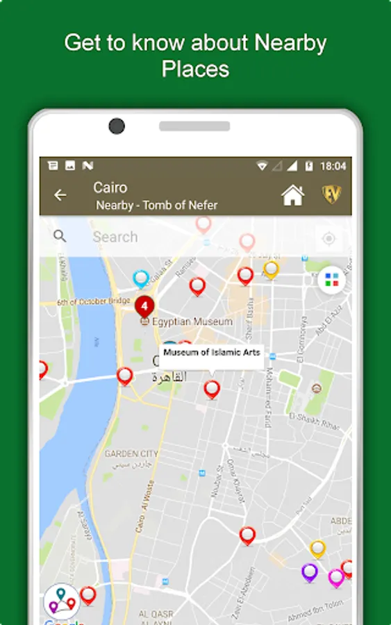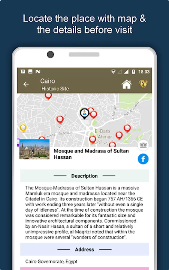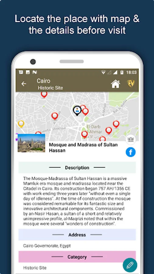 Apart from this, Cairo Travel & Explore guides you Why, When and How to visit various places in Cairo with precise location on the detailed Map. There are two ways to explore this app - Category view and EduBank favorite places view. Pin your destinations and get the routes on the Map. Not only this, you can see exactly how the places look like with Street View integrated in this app. The app also has a feature to Rate and write Review/Experience regarding entity(s) through Login. Your Travel experience and rating will help the user community.