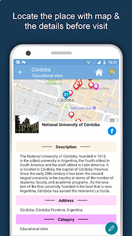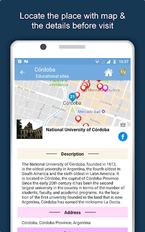 Apart from this, Cordoba Travel & Explore guides you Why, When and How to visit various places in Cordoba with precise location on the detailed Map. There are two ways to explore this app - Category view and EduBank favorite places view. Pin your destinations and get the routes on the Map. Not only this, you can see exactly how the places look like with Street View integrated in this app. The app also has a feature to Rate and write Review/Experience regarding entity(s) through Login. Your Travel experience and rating will help the user community.