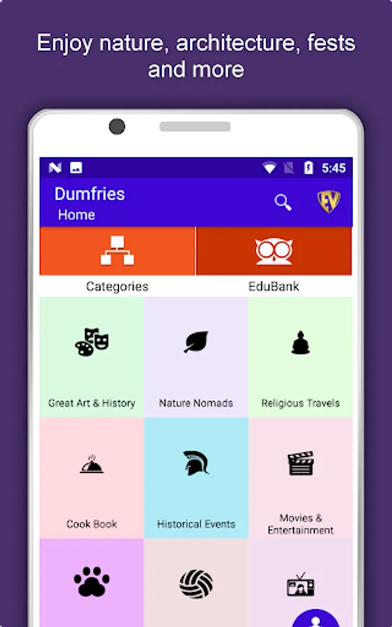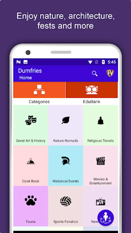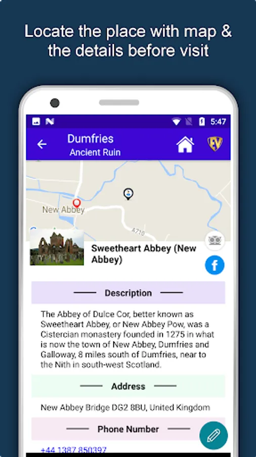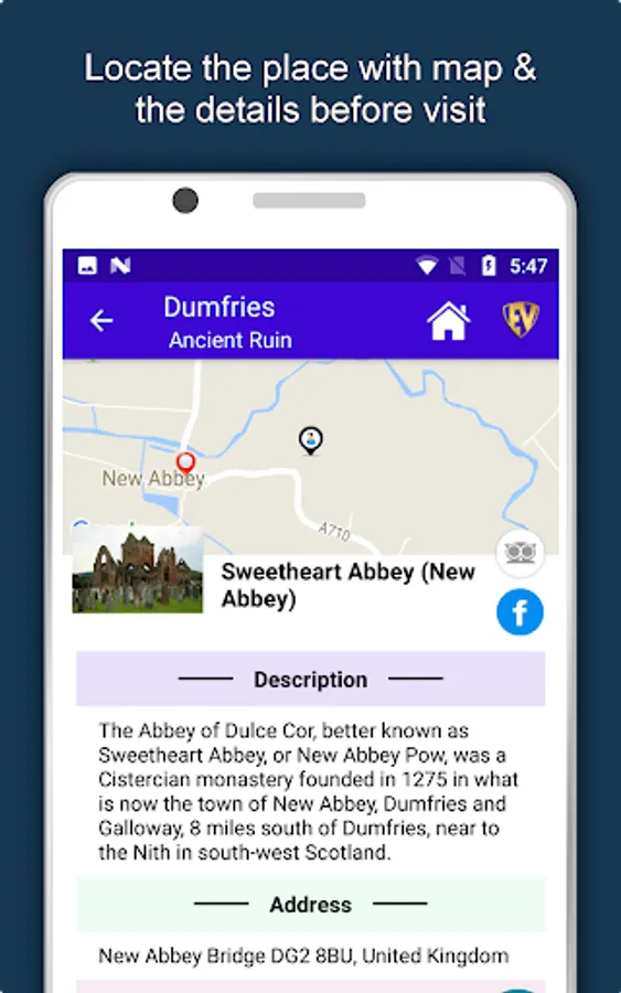 Apart from this, Dumfries Travel & Explore guides you Why, When and How to visit various places in Dumfries with precise location on the detailed Map. There are two ways to explore this app - Category view and EduBank favorite places view. Pin your destinations and get the routes on the Map. Not only this, you can see exactly how the places look like with Street View integrated in this app. The app also has a feature to Rate and write Review/Experience regarding entity(s) through Login. Your Travel experience and rating will help the user community.
