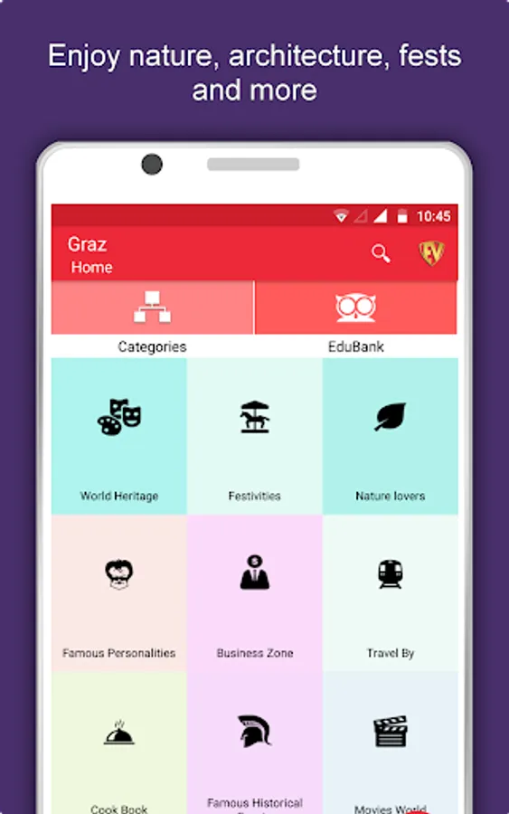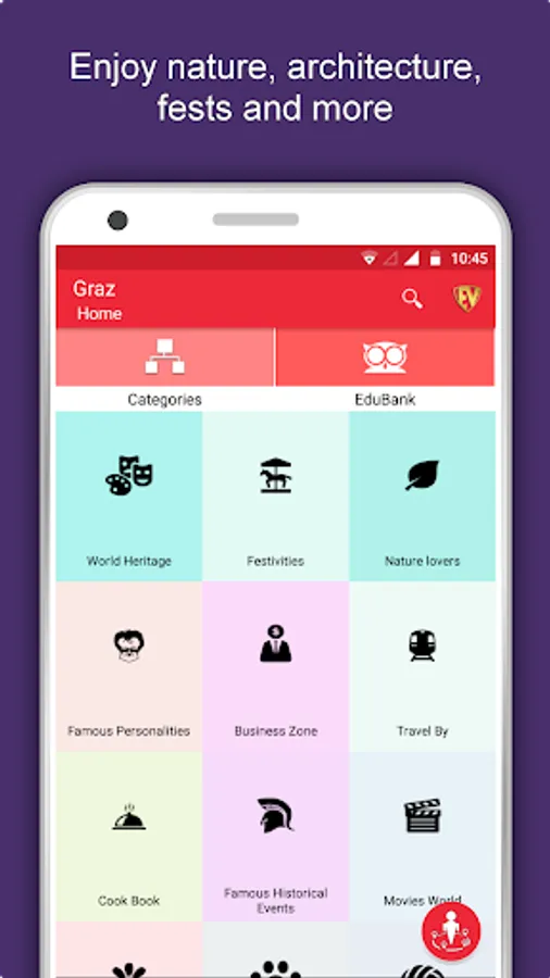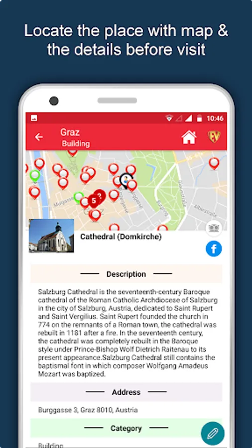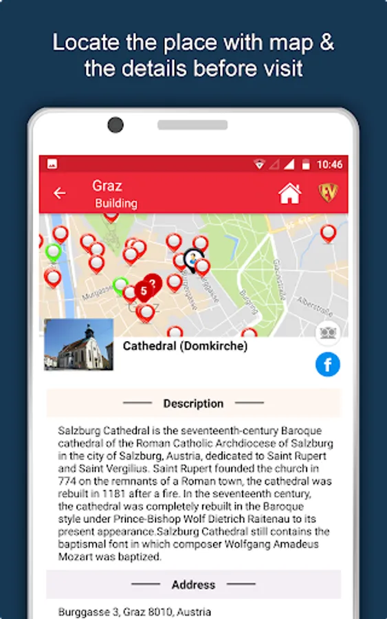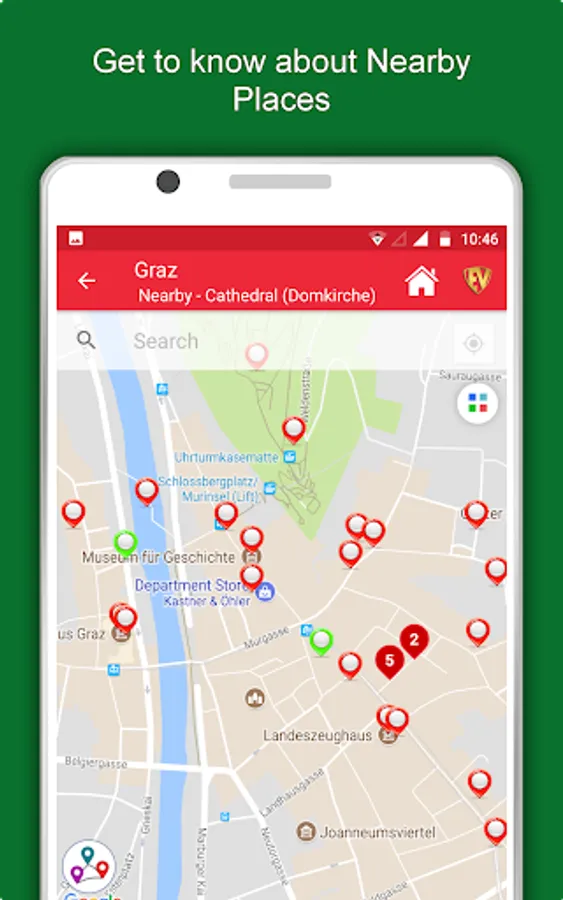 Apart from this, Graz Travel & Explore guides you Why, When and How to visit various places in Graz with precise location on the detailed Map. There are two ways to explore this app - Category view and EduBank favorite places view. Pin your destinations and get the routes on the Map. Not only this, you can see exactly how the places look like with Street View integrated in this app. The app also has a feature to Rate and write Review/Experience regarding entity(s) through Login. Your Travel experience and rating will help the user community.