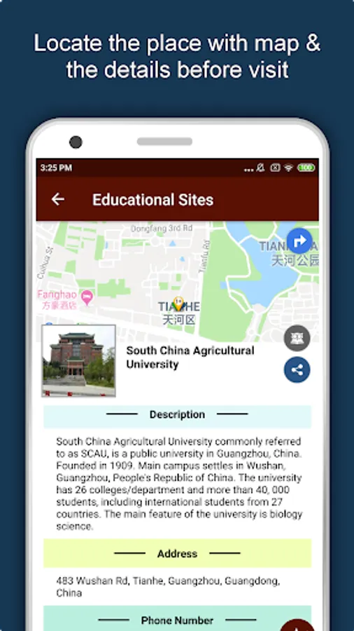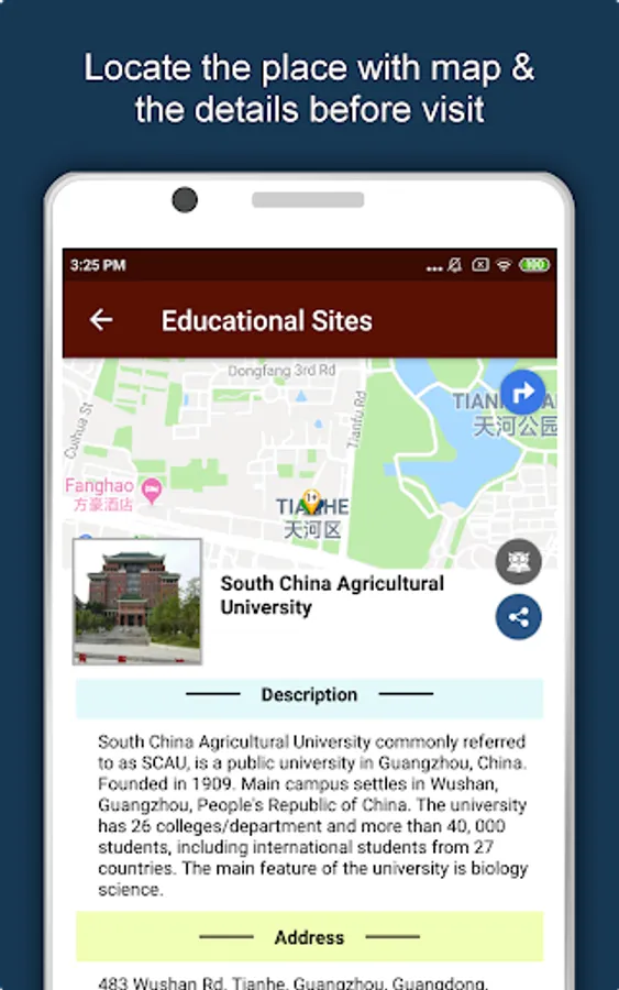 Apart from this, Guangzhou Travel & Explore guides you Why, When and How to visit various places in Guangzhou with precise location on the detailed Map. There are two ways to explore this app - Category view and EduBank favorite places view. Pin your destinations and get the routes on the Map. Not only this, you can see exactly how the places look like with Street View integrated in this app. The app also has a feature to Rate and write Review/Experience regarding entity(s) through Login. Your Travel experience and rating will help the user community.
