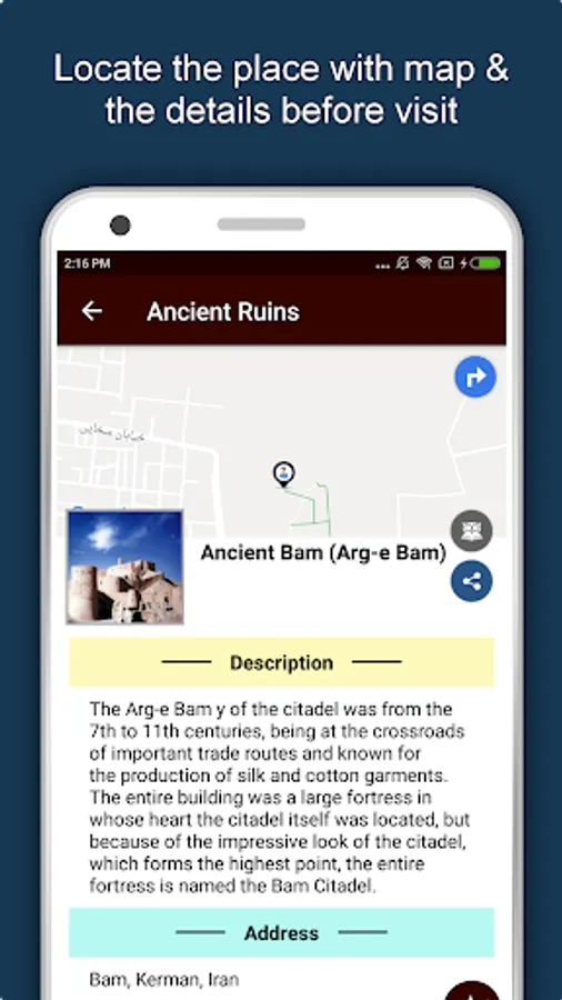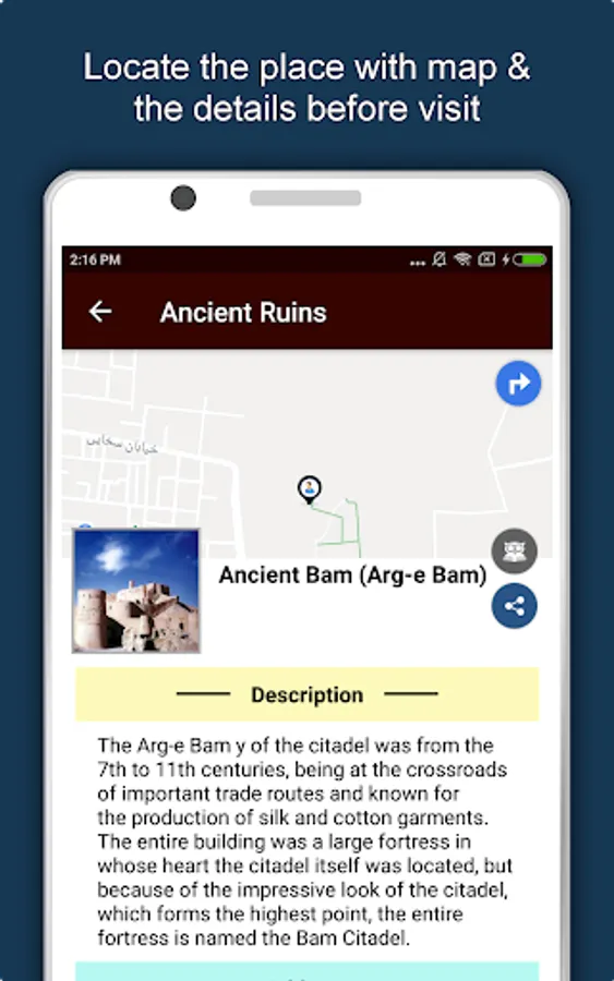 Apart from this, Iran Travel & Explore guides you Why, When and How to visit various places in Iran with precise location on the detailed Map. There are three ways to explore this app - Category view, City view and EduBank favorite places view. Pin your destinations and get the routes on the Map. Not only this, you can see exactly how the places look like with Street View integrated in this app. The app also has a feature to Rate and write Review/Experience regarding entity(s) through Login. Your Travel experience and rating will help the user community.