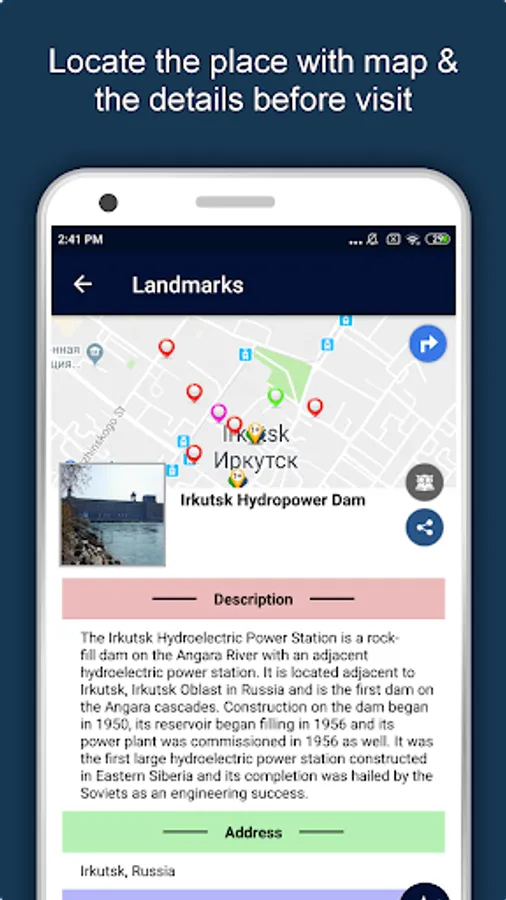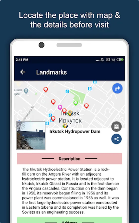 Apart from this, Irkutsk Travel & Explore guides you Why, When and How to visit various places in Irkutsk with precise location on the detailed Map. There are two ways to explore this app - Category view and EduBank favorite places view. Pin your destinations and get the routes on the Map. Not only this, you can see exactly how the places look like with Street View integrated in this app. The app also has a feature to Rate and write Review/Experience regarding entity(s) through Login. Your Travel experience and rating will help the user community.