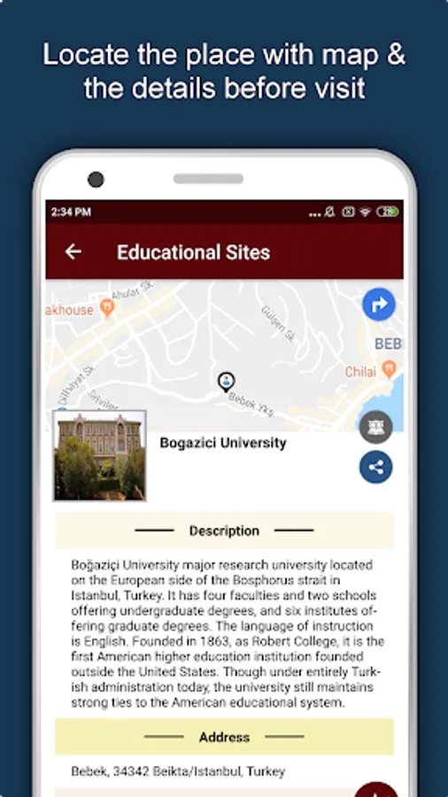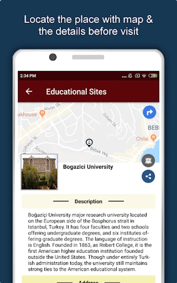 Apart from this, Istanbul Travel & Explore guides you Why, When and How to visit various places in Istanbul with precise location on the detailed Map. There are two ways to explore this app - Category view and EduBank favorite places view. Pin your destinations and get the routes on the Map. Not only this, you can see exactly how the places look like with Street View integrated in this app. The app also has a feature to Rate and write Review/Experience regarding entity(s) through Login. Your Travel experience and rating will help the user community.