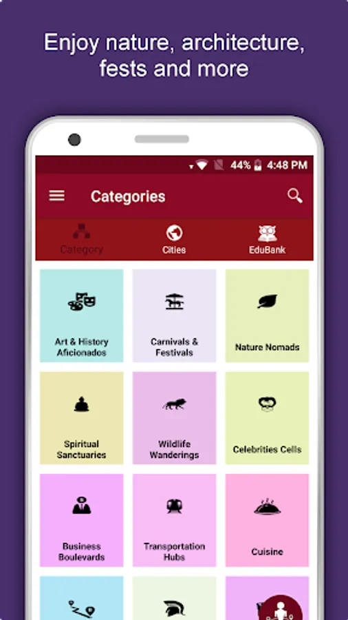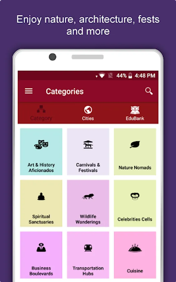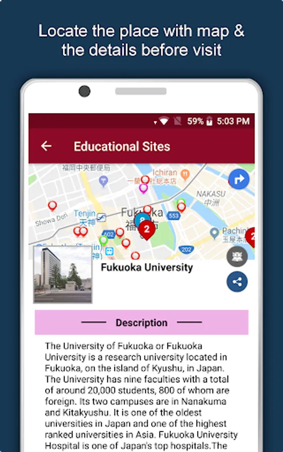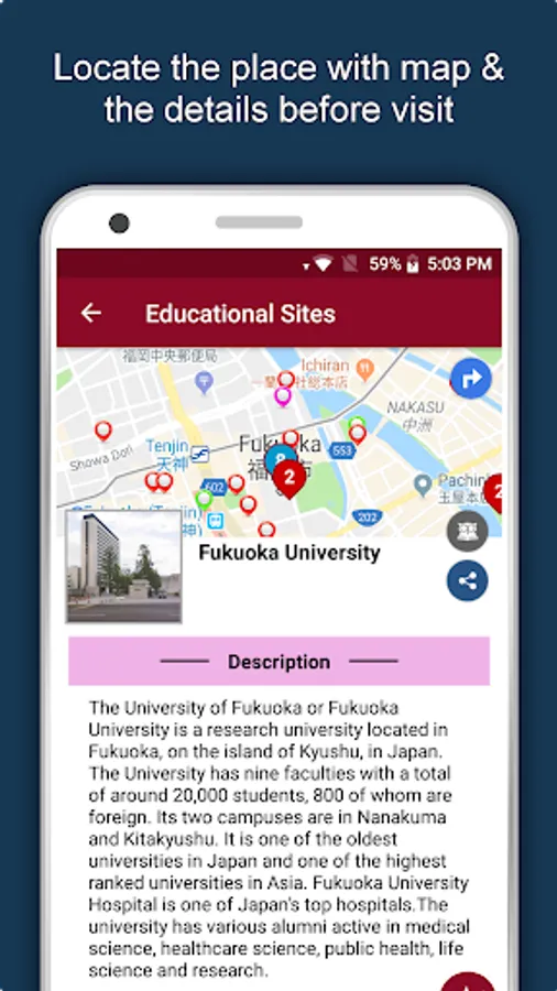 Apart from this, Japan Travel & Explore guides you Why, When and How to visit various places in Japan with precise location on the detailed Map. There are three ways to explore this app - Category view, City view and EduBank favorite places view. Pin your destinations and get the routes on the Map. Not only this, you can see exactly how the places look like with Street View integrated in this app. The app also has a feature to Rate and write Review/Experience regarding entity(s) through Login. Your Travel experience and rating will help the user community.