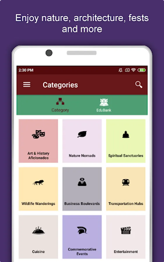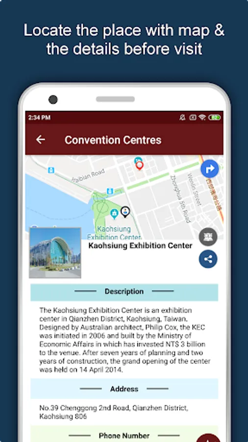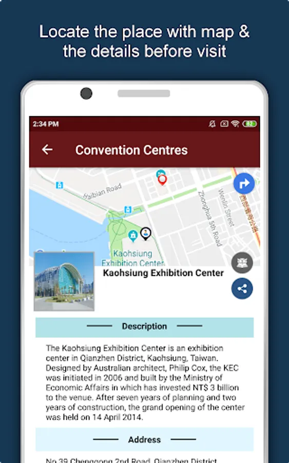 Apart from this, Kaohsiung Travel & Explore guides you Why, When and How to visit various places in Kaohsiung with precise location on the detailed Map. There are two ways to explore this app - Category view and EduBank favorite places view. Pin your destinations and get the routes on the Map. Not only this, you can see exactly how the places look like with Street View integrated in this app. The app also has a feature to Rate and write Review/Experience regarding entity(s) through Login. Your Travel experience and rating will help the user community.