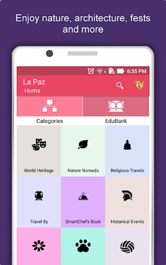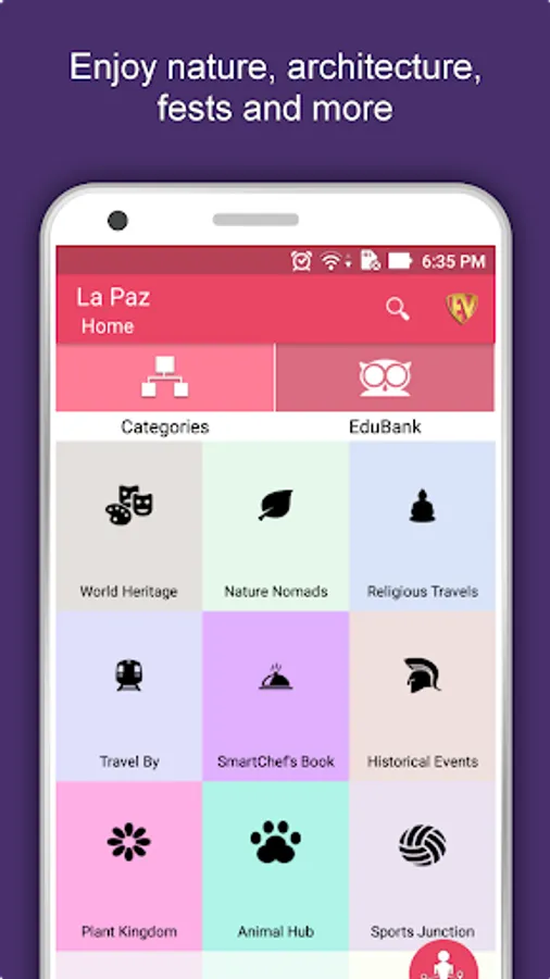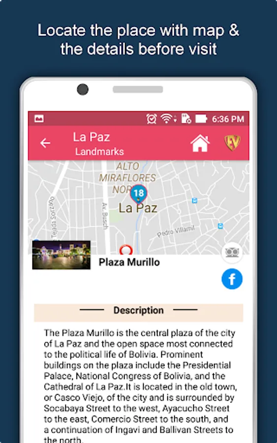 Apart from this, La Paz Travel & Explore guides you Why, When and How to visit various places in La Paz with precise location on the detailed Map. There are two ways to explore this app - Category view and EduBank favorite places view. Pin your destinations and get the routes on the Map. Not only this, you can see exactly how the places look like with Street View integrated in this app. The app also has a feature to Rate and write Review/Experience regarding entity(s) through Login. Your Travel experience and rating will help the user community.