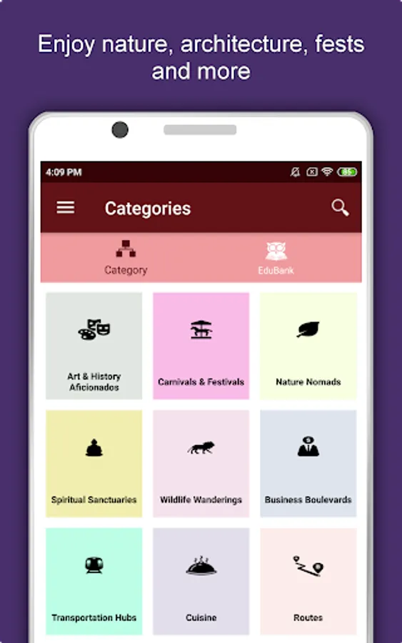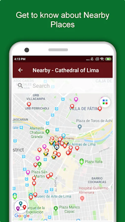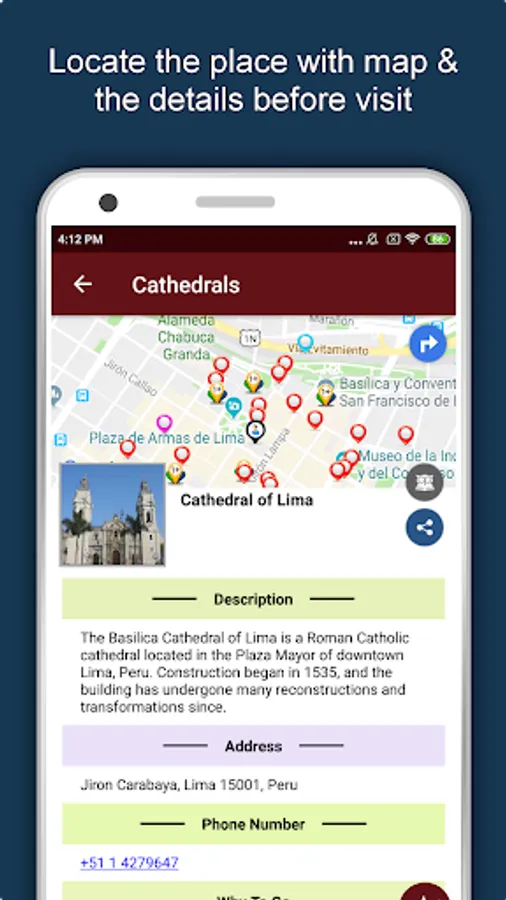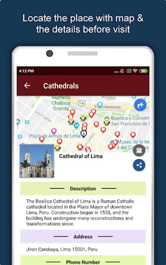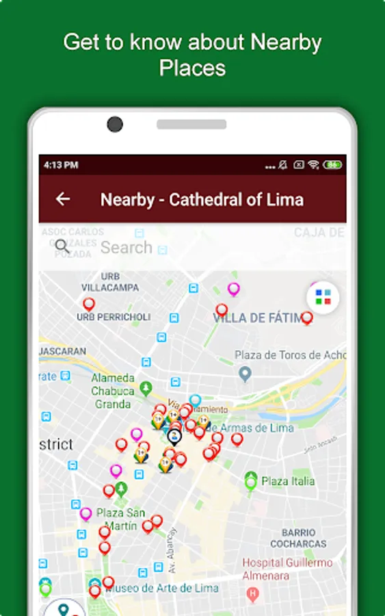 Apart from this, Lima Travel & Explore guides you Why, When and How to visit various places in Lima with precise location on the detailed Map. There are two ways to explore this app - Category view and EduBank favorite places view. Pin your destinations and get the routes on the Map. Not only this, you can see exactly how the places look like with Street View integrated in this app. The app also has a feature to Rate and write Review/Experience regarding entity(s) through Login. Your Travel experience and rating will help the user community.