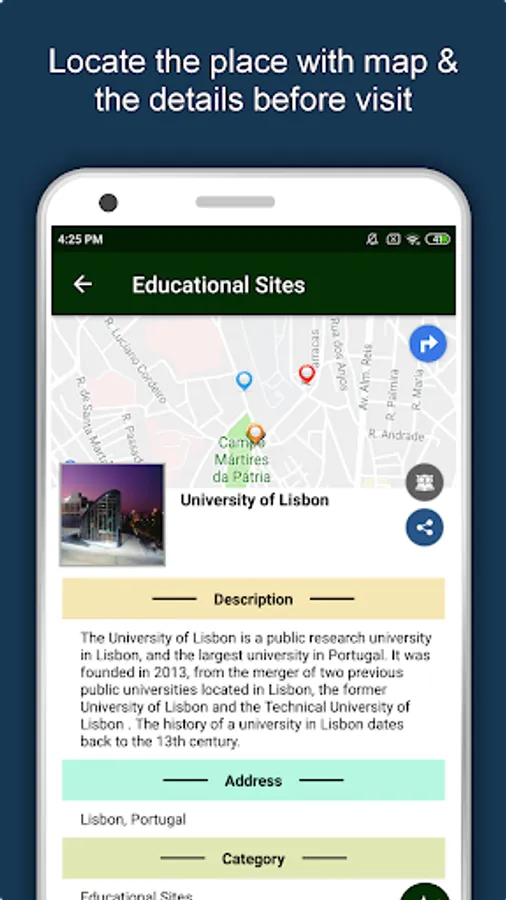 Apart from this, Lisbon Travel & Explore guides you Why, When and How to visit various places in Lisbon with precise location on the detailed Map. There are two ways to explore this app - Category view and EduBank favorite places view. Pin your destinations and get the routes on the Map. Not only this, you can see exactly how the places look like with Street View integrated in this app. The app also has a feature to Rate and write Review/Experience regarding entity(s) through Login. Your Travel experience and rating will help the user community.