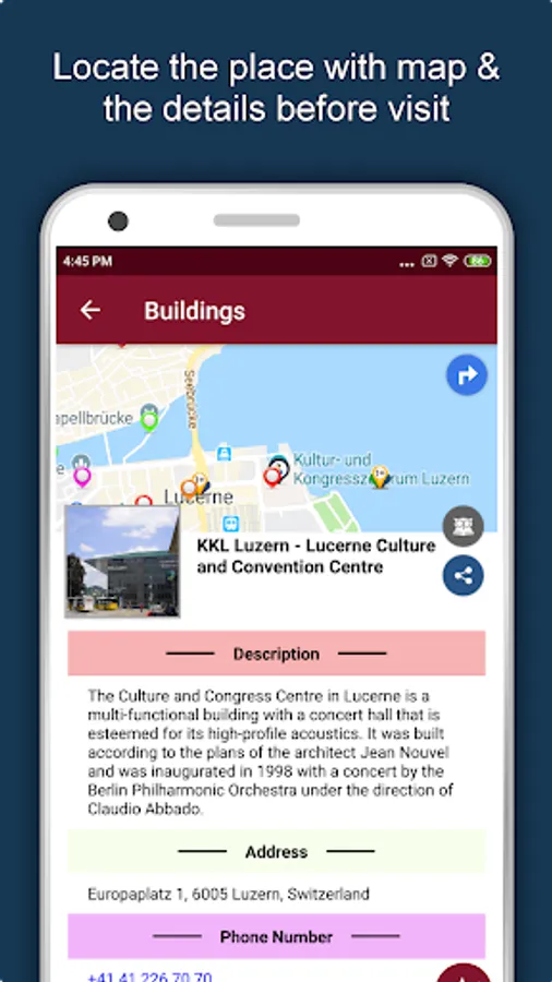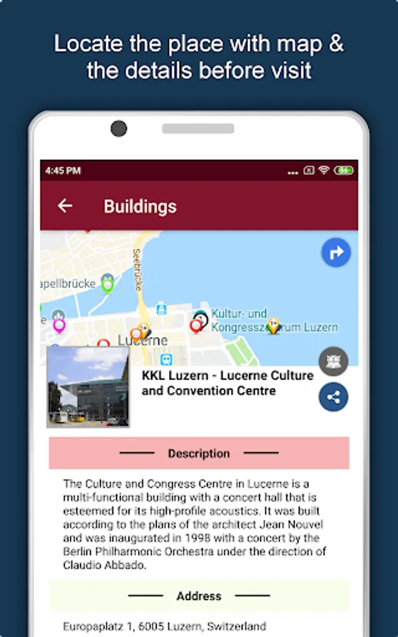 Apart from this, Lucerne Travel & Explore guides you Why, When and How to visit various places in Lucerne with precise location on the detailed Map. There are two ways to explore this app - Category view and EduBank favorite places view. Pin your destinations and get the routes on the Map. Not only this, you can see exactly how the places look like with Street View integrated in this app. The app also has a feature to Rate and write Review/Experience regarding entity(s) through Login. Your Travel experience and rating will help the user community.