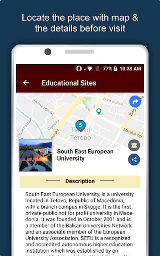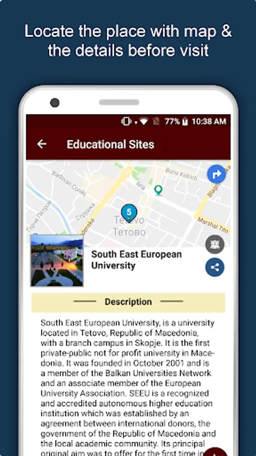Apart from this, Macedonia Travel & Explore guides you Why, When and How to visit various places in Macedonia with precise location on the detailed Map. There are three ways to explore this app - Category view, City view and EduBank favorite places view. Pin your destinations and get the routes on the Map. Not only this, you can see exactly how the places look like with Street View integrated in this app. The app also has a feature to Rate and write Review/Experience regarding entity(s) through Login. Your Travel experience and rating will help the user community.