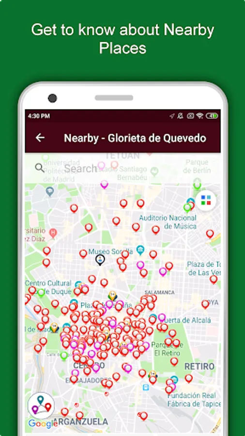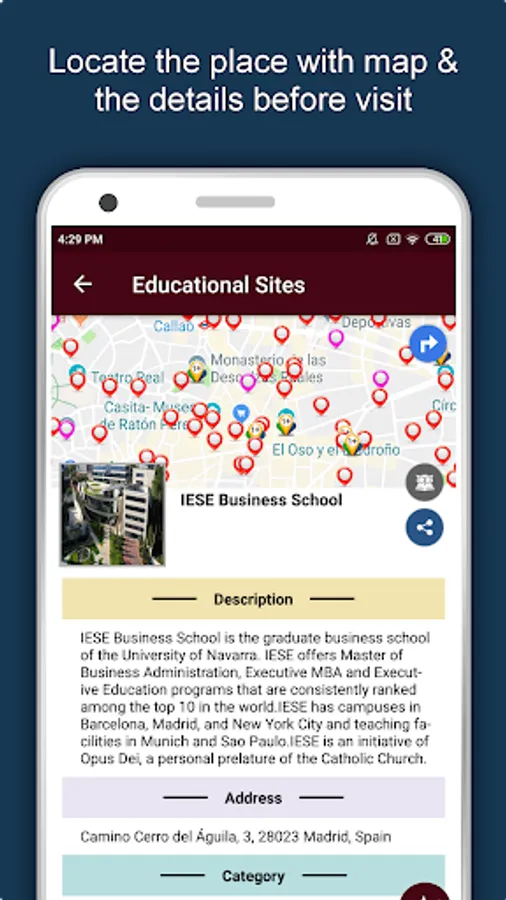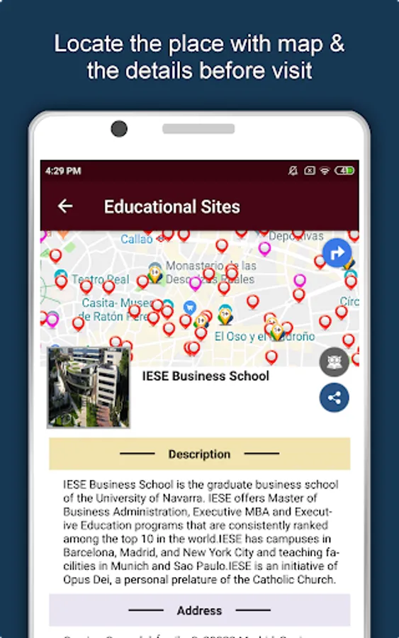 Apart from this, Madrid Travel & Explore guides you Why, When and How to visit various places in Madrid with precise location on the detailed Map. There are two ways to explore this app - Category view and EduBank favorite places view. Pin your destinations and get the routes on the Map. Not only this, you can see exactly how the places look like with Street View integrated in this app. The app also has a feature to Rate and write Review/Experience regarding entity(s) through Login. Your Travel experience and rating will help the user community.