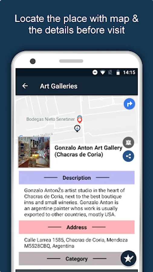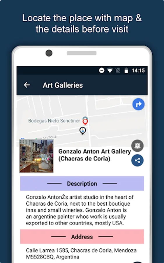 Apart from this, Mendoza Travel & Explore guides you Why, When and How to visit various places in Mendoza with precise location on the detailed Map. There are two ways to explore this app - Category view and EduBank favorite places view. Pin your destinations and get the routes on the Map. Not only this, you can see exactly how the places look like with Street View integrated in this app. The app also has a feature to Rate and write Review/Experience regarding entity(s) through Login. Your Travel experience and rating will help the user community.