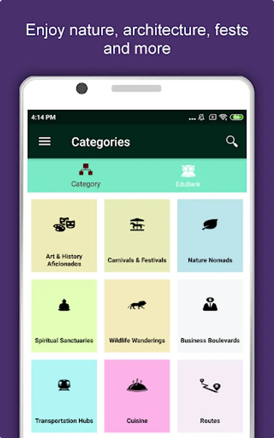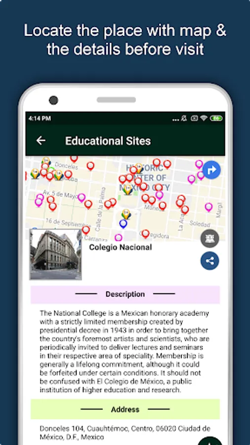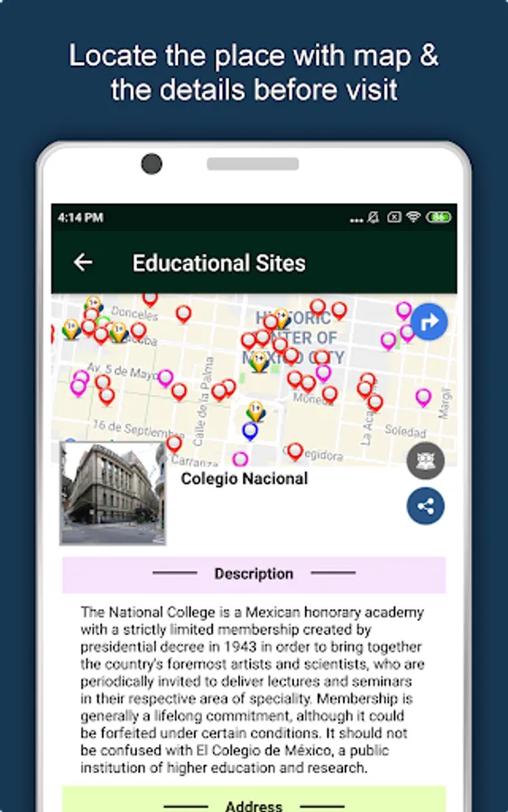 Apart from this, Mexico City Travel & Explore guides you Why, When and How to visit various places in Mexico City with precise location on the detailed Map. There are two ways to explore this app - Category view and EduBank favorite places view. Pin your destinations and get the routes on the Map. Not only this, you can see exactly how the places look like with Street View integrated in this app. The app also has a feature to Rate and write Review/Experience regarding entity(s) through Login. Your Travel experience and rating will help the user community.