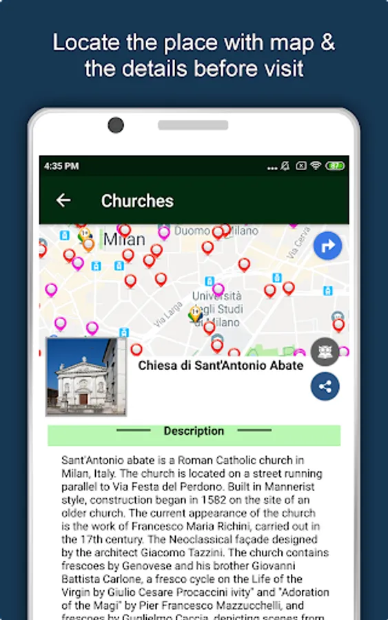Apart from this, Milan Travel & Explore guides you Why, When and How to visit various places in Milan with precise location on the detailed Map. There are two ways to explore this app - Category view and EduBank favorite places view. Pin your destinations and get the routes on the Map. Not only this, you can see exactly how the places look like with Street View integrated in this app. The app also has a feature to Rate and write Review/Experience regarding entity(s) through Login. Your Travel experience and rating will help the user community.