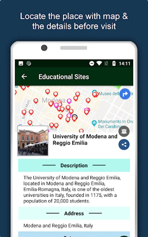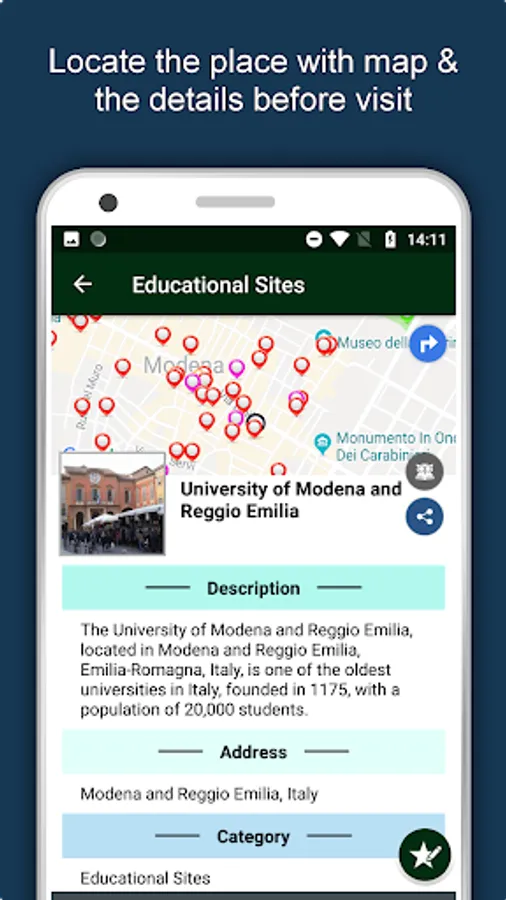 Apart from this, Modena Travel & Explore guides you Why, When and How to visit various places in Modena with precise location on the detailed Map. There are two ways to explore this app - Category view and EduBank favorite places view. Pin your destinations and get the routes on the Map. Not only this, you can see exactly how the places look like with Street View integrated in this app. The app also has a feature to Rate and write Review/Experience regarding entity(s) through Login. Your Travel experience and rating will help the user community.