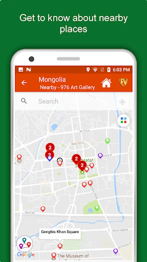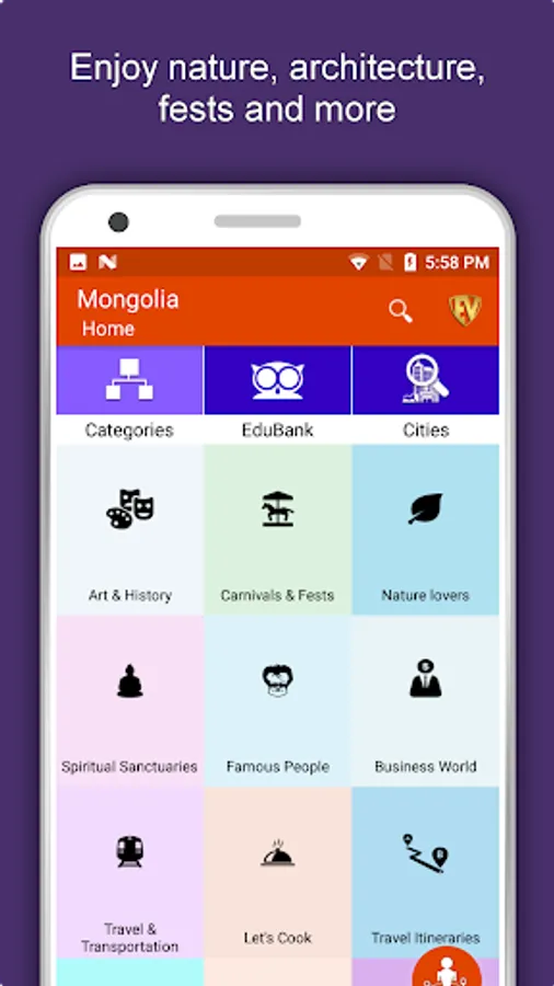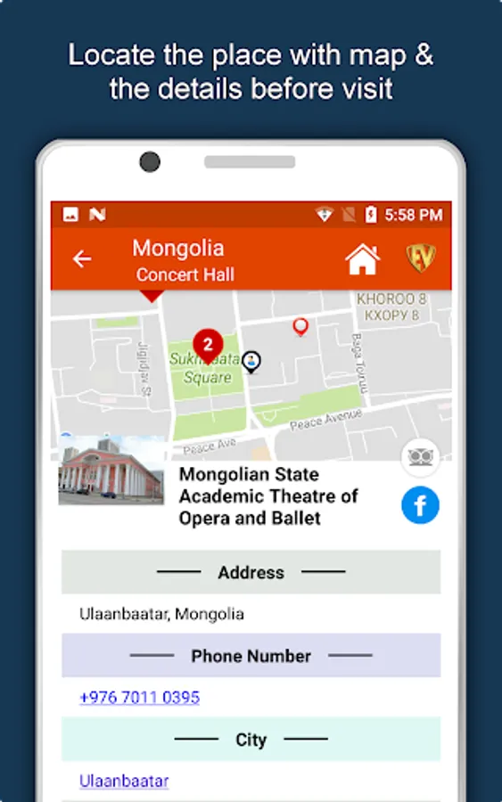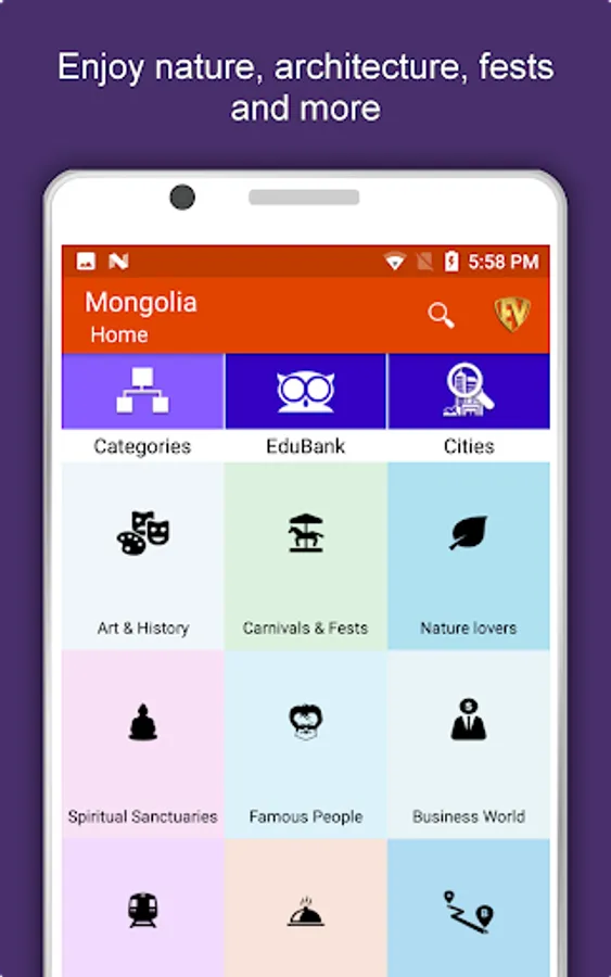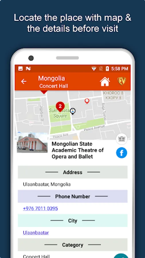 Apart from this, Mongolia Travel & Explore guides you Why, When and How to visit various places in Mongolia with precise location on the detailed Map. There are three ways to explore this app - Category view, City view and EduBank favorite places view. Pin your destinations and get the routes on the Map. Not only this, you can see exactly how the places look like with Street View integrated in this app. The app also has a feature to Rate and write Review/Experience regarding entity(s) through Login. Your Travel experience and rating will help the user community.