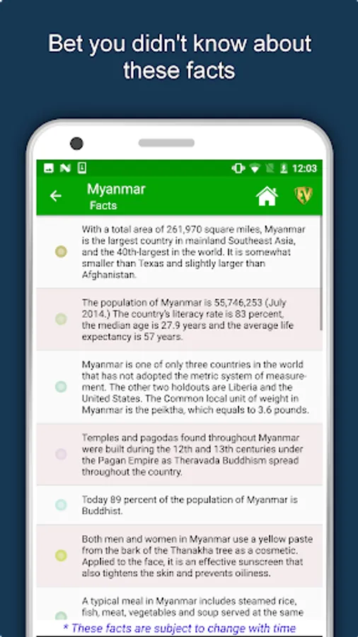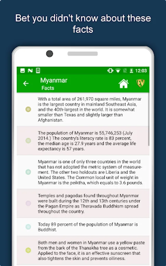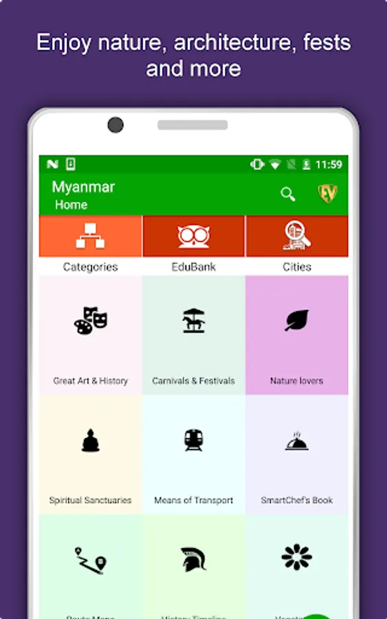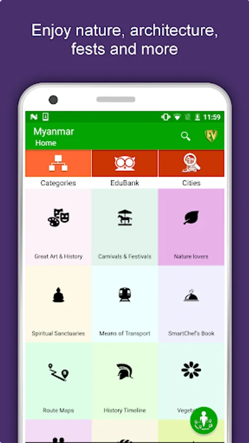 All features and images in Myanmar Country Guide are available offline. This Myanmar Travel App is for the globetrotters who go by the quote, “All journeys have secret destinations of which the traveler is unaware”. With Myanmar Tourist Guide, Unveil the Veiled places, Connect with plethora of people, understand culture, art and history, Speak with natives in their language, relish the authentic food and take delight in the festivities.