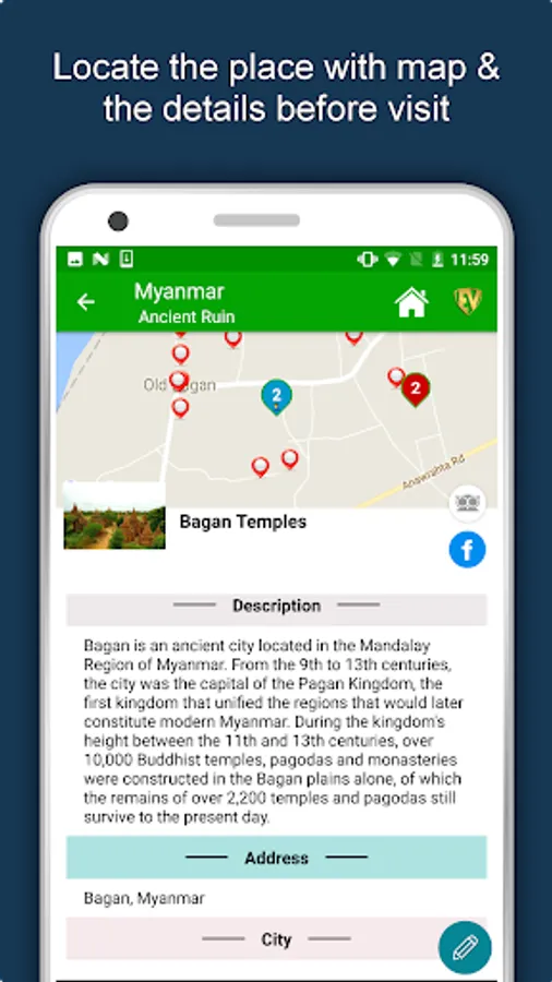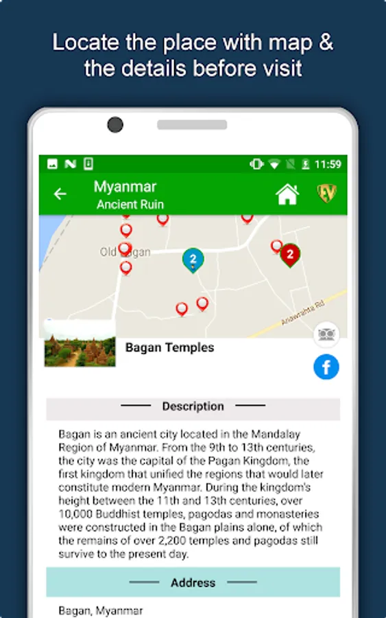 Apart from this, Myanmar Travel & Explore guides you Why, When and How to visit various places in Myanmar with precise location on the detailed Map. There are three ways to explore this app - Category view, City view and EduBank favorite places view. Pin your destinations and get the routes on the Map. Not only this, you can see exactly how the places look like with Street View integrated in this app. The app also has a feature to Rate and write Review/Experience regarding entity(s) through Login. Your Travel experience and rating will help the user community.