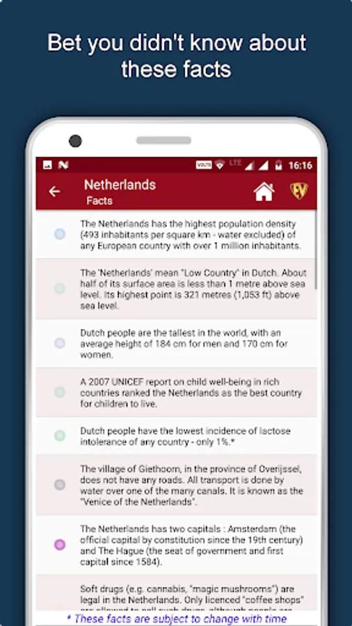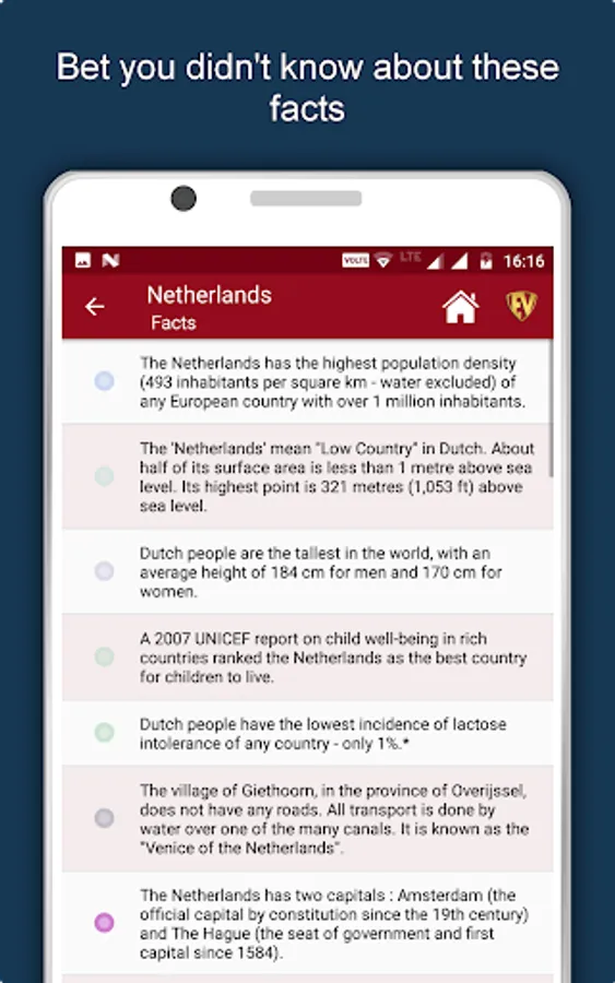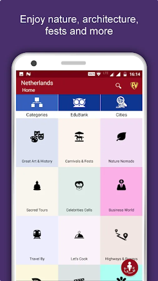 All features and images in Netherlands Country Guide are available offline. This Netherlands Travel App is for the globetrotters who go by the quote, “All journeys have secret destinations of which the traveler is unaware”. With Netherlands Tourist Guide, Unveil the Veiled places, Connect with plethora of people, understand culture, art and history, Speak with natives in their language, relish the authentic food and take delight in the festivities.