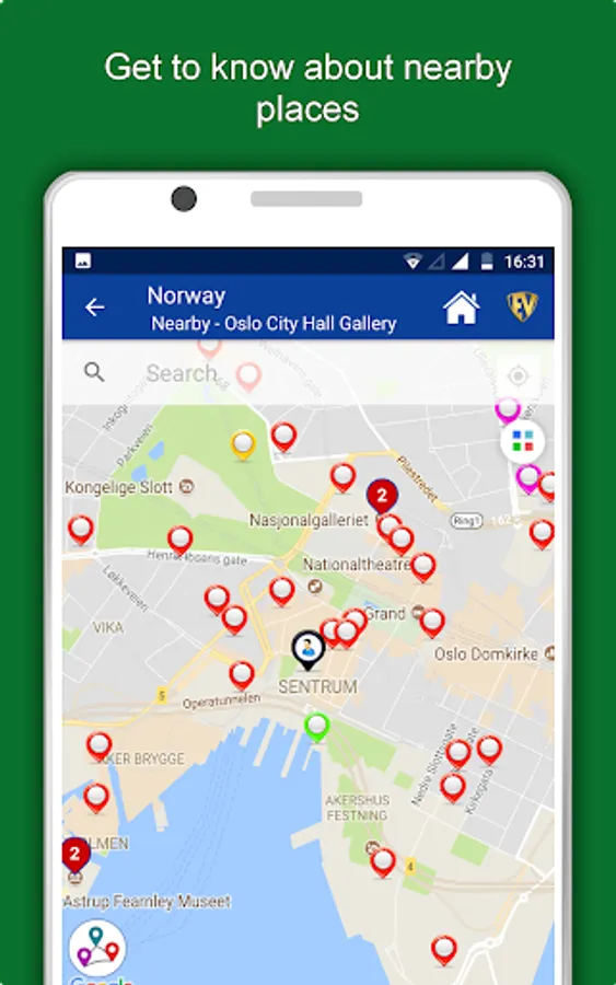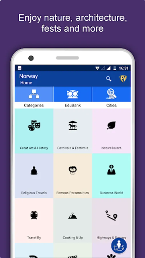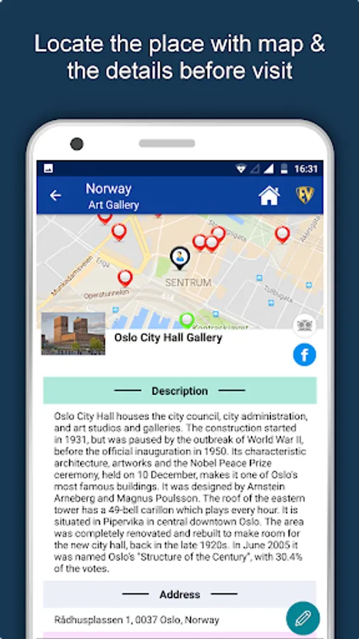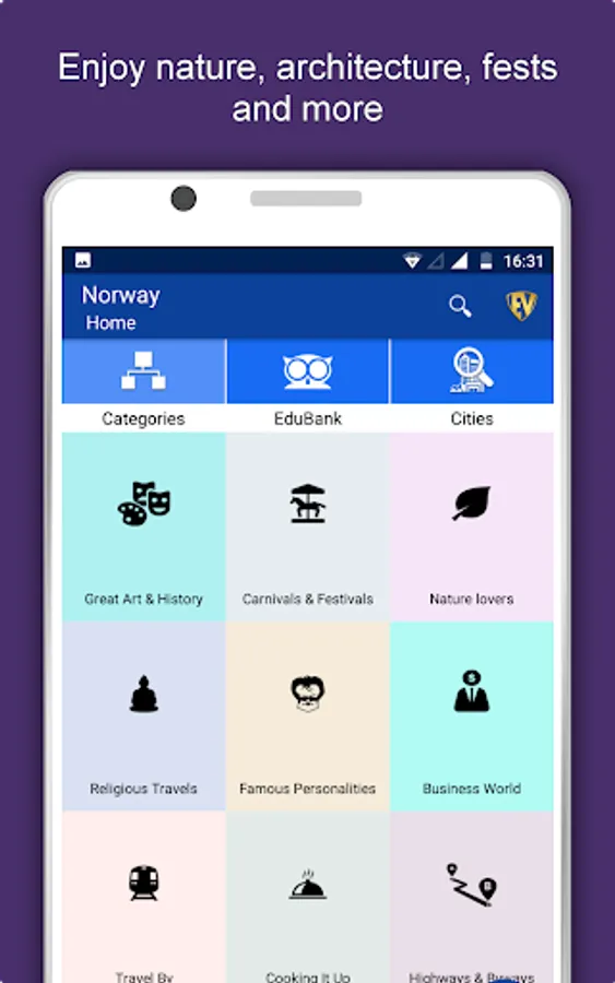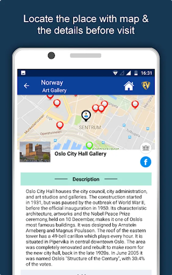 Apart from this, Norway Travel & Explore guides you Why, When and How to visit various places in Norway with precise location on the detailed Map. There are three ways to explore this app - Category view, City view and EduBank favorite places view. Pin your destinations and get the routes on the Map. Not only this, you can see exactly how the places look like with Street View integrated in this app. The app also has a feature to Rate and write Review/Experience regarding entity(s) through Login. Your Travel experience and rating will help the user community.