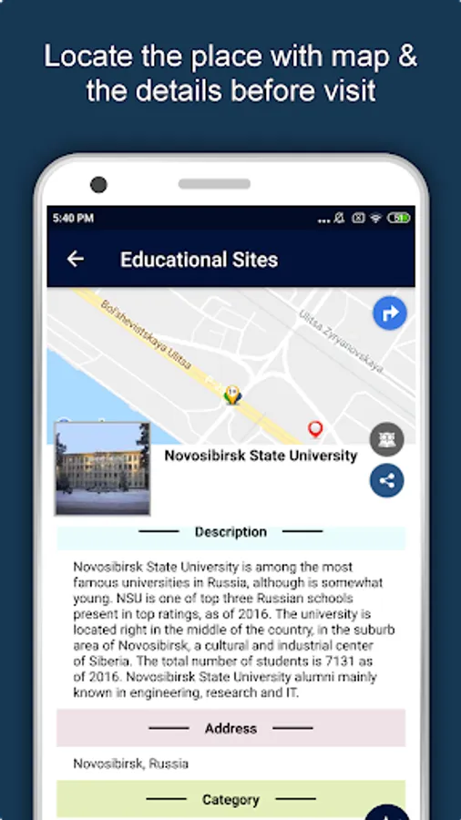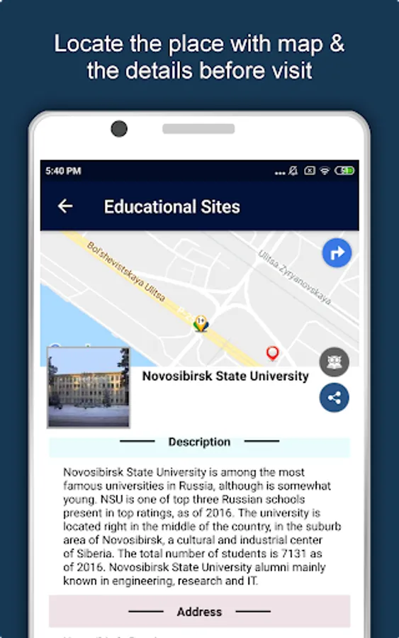 Apart from this, Novosibirsk Travel & Explore guides you Why, When and How to visit various places in Novosibirsk with precise location on the detailed Map. There are two ways to explore this app - Category view and EduBank favorite places view. Pin your destinations and get the routes on the Map. Not only this, you can see exactly how the places look like with Street View integrated in this app. The app also has a feature to Rate and write Review/Experience regarding entity(s) through Login. Your Travel experience and rating will help the user community.