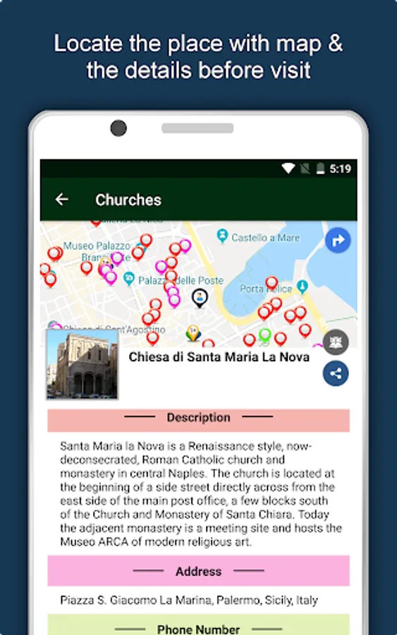Apart from this, Palermo Travel & Explore guides you Why, When and How to visit various places in Palermo with precise location on the detailed Map. There are two ways to explore this app - Category view and EduBank favorite places view. Pin your destinations and get the routes on the Map. Not only this, you can see exactly how the places look like with Street View integrated in this app. The app also has a feature to Rate and write Review/Experience regarding entity(s) through Login. Your Travel experience and rating will help the user community.