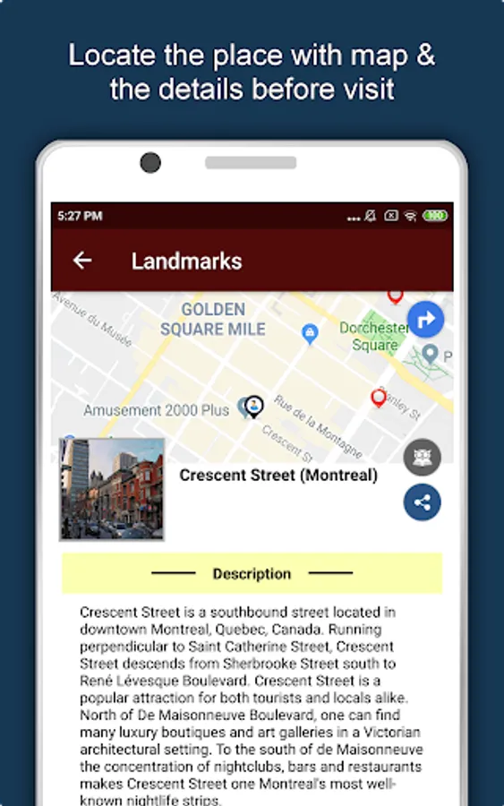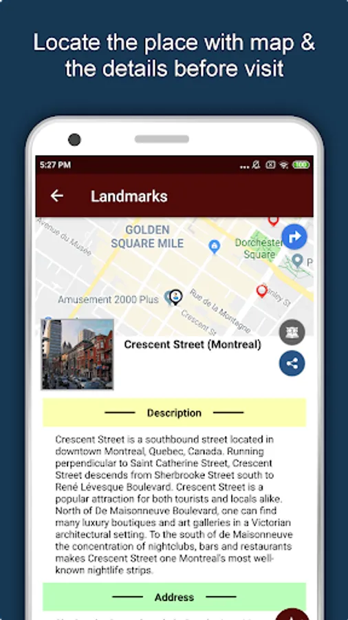 Apart from this, Quebec City Travel & Explore guides you Why, When and How to visit various places in Quebec City with precise location on the detailed Map. There are two ways to explore this app - Category view and EduBank favorite places view. Pin your destinations and get the routes on the Map. Not only this, you can see exactly how the places look like with Street View integrated in this app. The app also has a feature to Rate and write Review/Experience regarding entity(s) through Login. Your Travel experience and rating will help the user community.