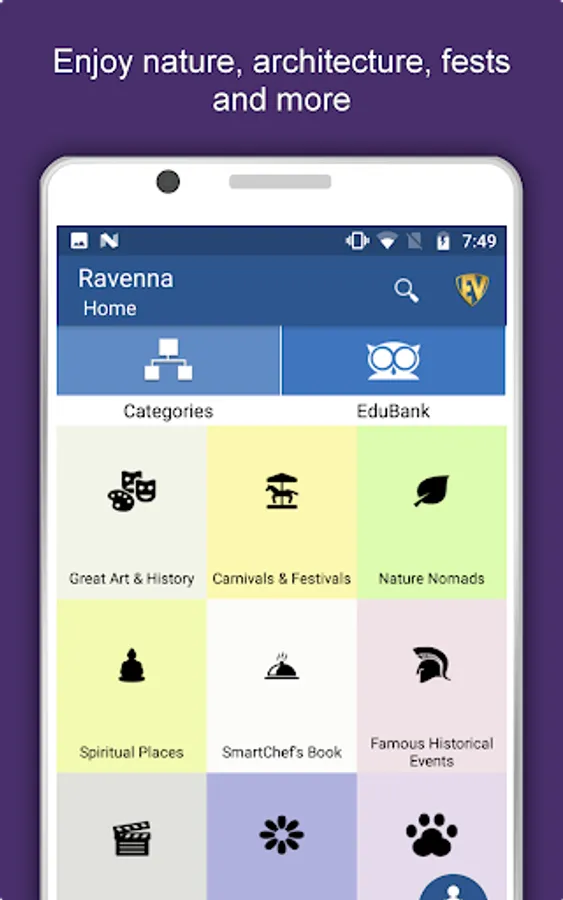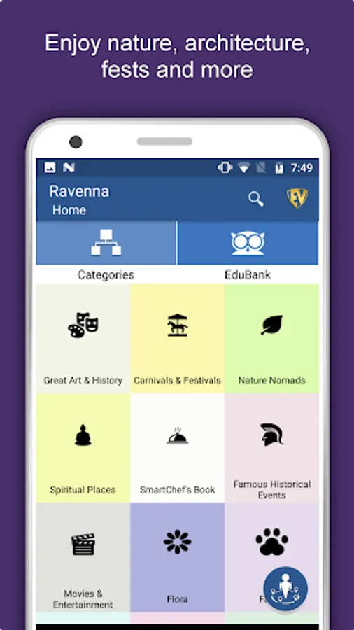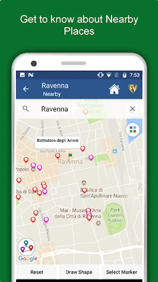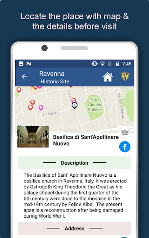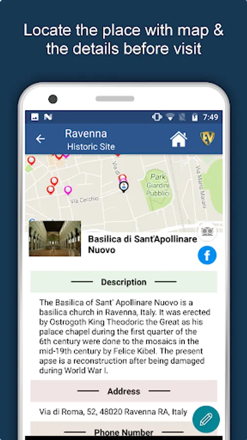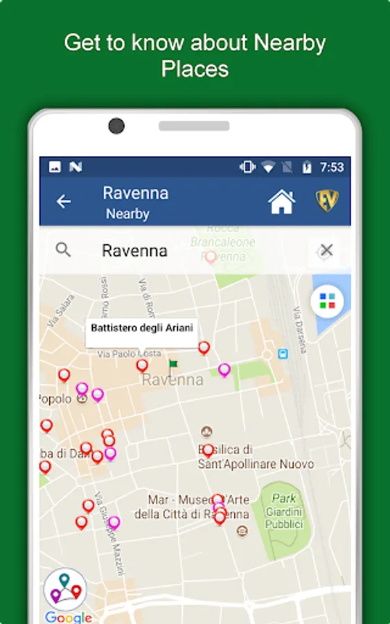 Apart from this, Ravenna Travel & Explore guides you Why, When and How to visit various places in Ravenna with precise location on the detailed Map. There are two ways to explore this app - Category view and EduBank favorite places view. Pin your destinations and get the routes on the Map. Not only this, you can see exactly how the places look like with Street View integrated in this app. The app also has a feature to Rate and write Review/Experience regarding entity(s) through Login. Your Travel experience and rating will help the user community.
