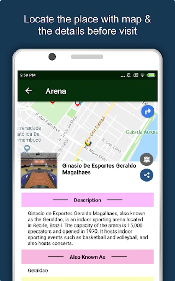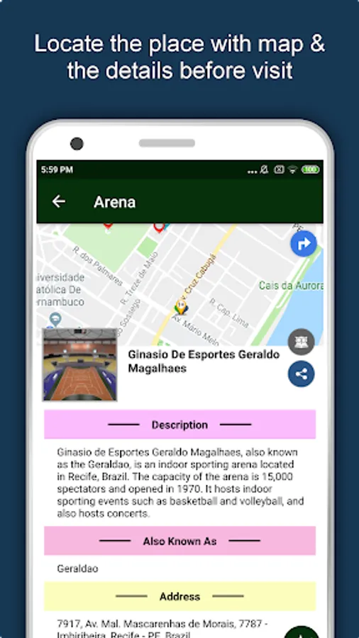 Apart from this, Recife Travel & Explore guides you Why, When and How to visit various places in Recife with precise location on the detailed Map. There are two ways to explore this app - Category view and EduBank favorite places view. Pin your destinations and get the routes on the Map. Not only this, you can see exactly how the places look like with Street View integrated in this app. The app also has a feature to Rate and write Review/Experience regarding entity(s) through Login. Your Travel experience and rating will help the user community.