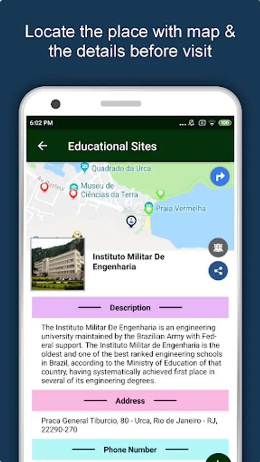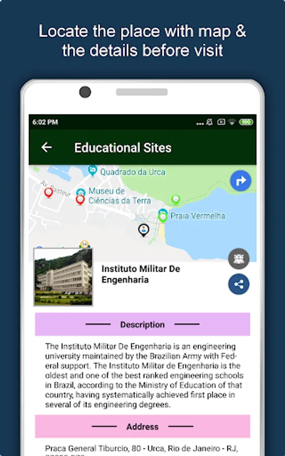 Apart from this, Rio De Janeiro Travel & Explore guides you Why, When and How to visit various places in Rio De Janeiro with precise location on the detailed Map. There are two ways to explore this app - Category view and EduBank favorite places view. Pin your destinations and get the routes on the Map. Not only this, you can see exactly how the places look like with Street View integrated in this app. The app also has a feature to Rate and write Review/Experience regarding entity(s) through Login. Your Travel experience and rating will help the user community.