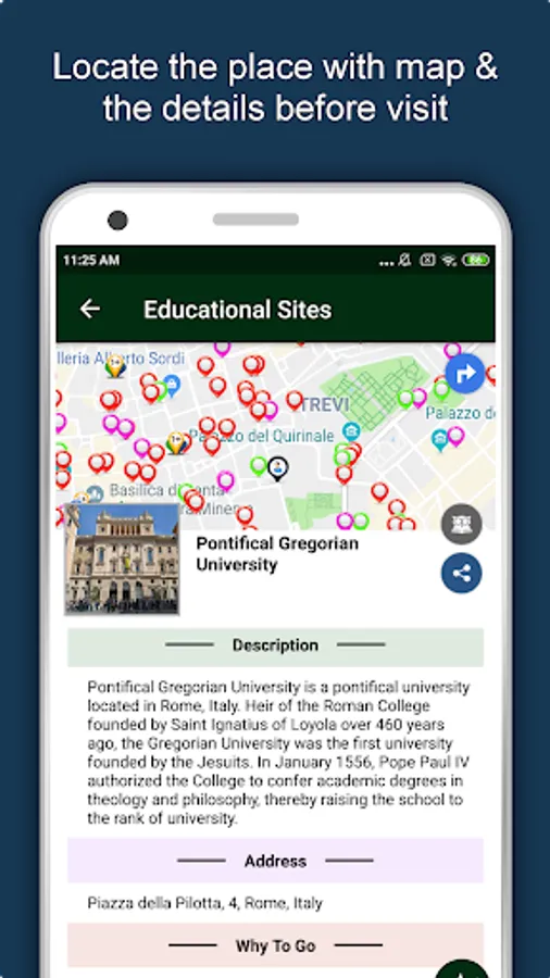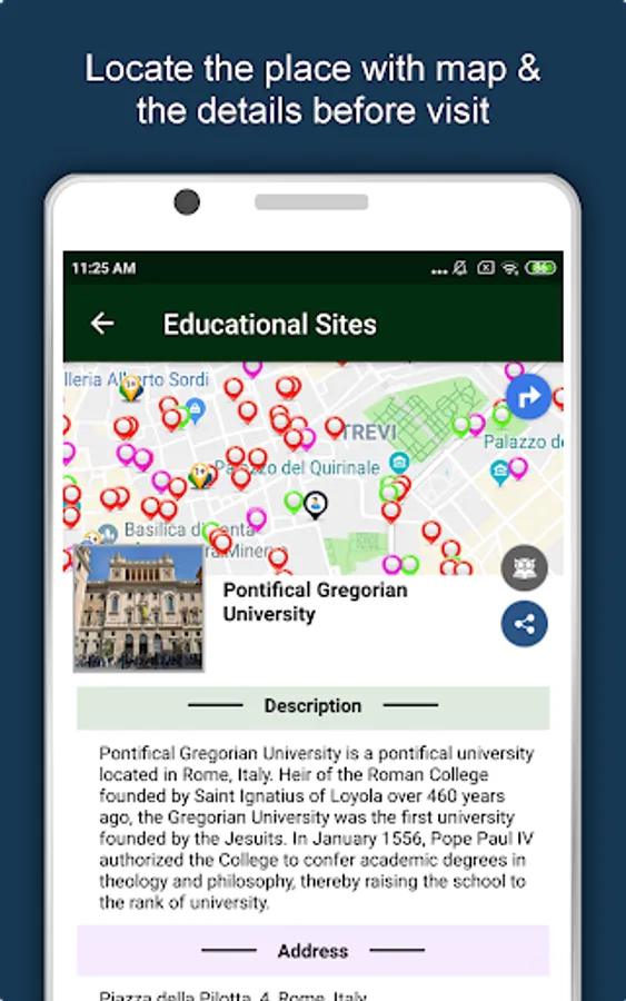 Apart from this, Rome Travel & Explore guides you Why, When and How to visit various places in Rome with precise location on the detailed Map. There are two ways to explore this app - Category view and EduBank favorite places view. Pin your destinations and get the routes on the Map. Not only this, you can see exactly how the places look like with Street View integrated in this app. The app also has a feature to Rate and write Review/Experience regarding entity(s) through Login. Your Travel experience and rating will help the user community.
