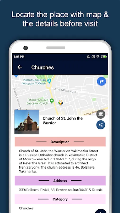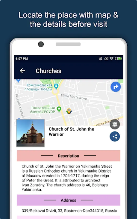 Apart from this, Rostov-on-Don Travel & Explore guides you Why, When and How to visit various places in Rostov-on-Don with precise location on the detailed Map. There are two ways to explore this app - Category view and EduBank favorite places view. Pin your destinations and get the routes on the Map. Not only this, you can see exactly how the places look like with Street View integrated in this app. The app also has a feature to Rate and write Review/Experience regarding entity(s) through Login. Your Travel experience and rating will help the user community.