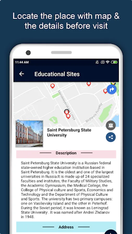 Apart from this, Saint Petersburg Travel & Explore guides you Why, When and How to visit various places in Saint Petersburg with precise location on the detailed Map. There are two ways to explore this app - Category view and EduBank favorite places view. Pin your destinations and get the routes on the Map. Not only this, you can see exactly how the places look like with Street View integrated in this app. The app also has a feature to Rate and write Review/Experience regarding entity(s) through Login. Your Travel experience and rating will help the user community.