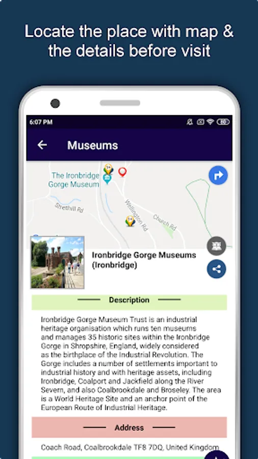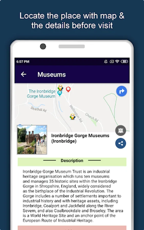 Apart from this, Shropshire Travel & Explore guides you Why, When and How to visit various places in Shropshire with precise location on the detailed Map. There are two ways to explore this app - Category view and EduBank favorite places view. Pin your destinations and get the routes on the Map. Not only this, you can see exactly how the places look like with Street View integrated in this app. The app also has a feature to Rate and write Review/Experience regarding entity(s) through Login. Your Travel experience and rating will help the user community.