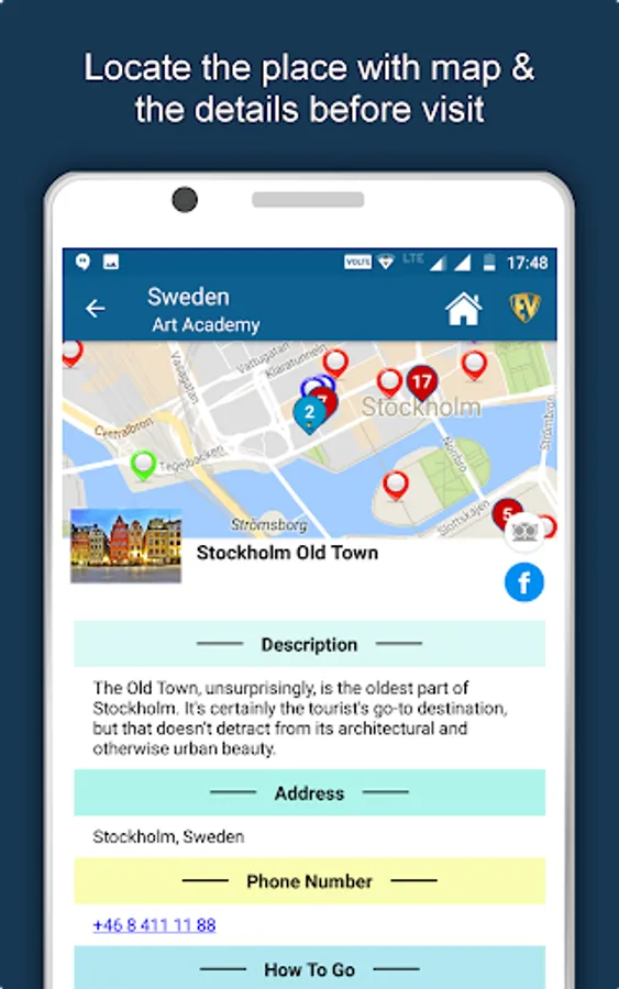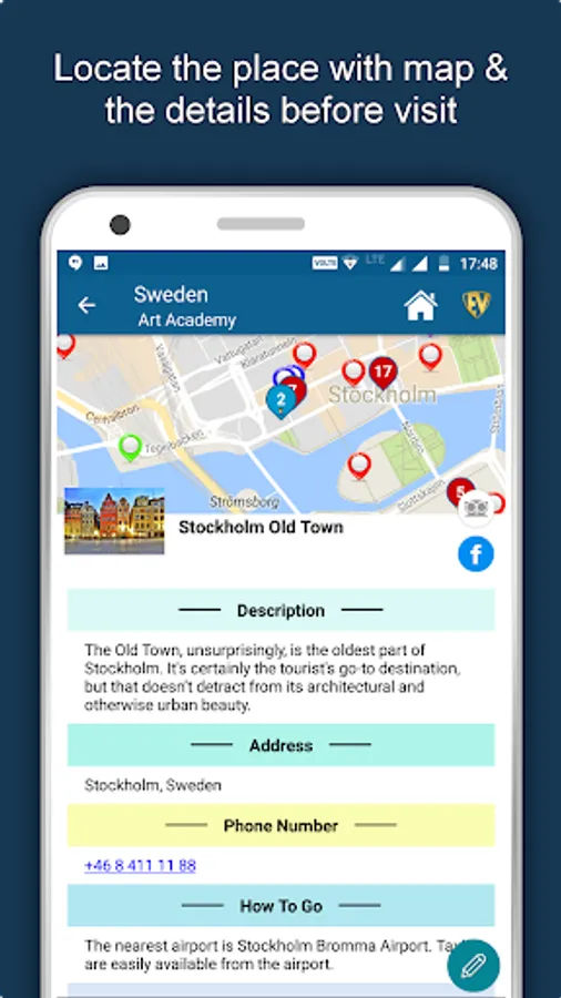 Apart from this, Sweden Travel & Explore guides you Why, When and How to visit various places in Sweden with precise location on the detailed Map. There are three ways to explore this app - Category view, City view and EduBank favorite places view. Pin your destinations and get the routes on the Map. Not only this, you can see exactly how the places look like with Street View integrated in this app. The app also has a feature to Rate and write Review/Experience regarding entity(s) through Login. Your Travel experience and rating will help the user community.