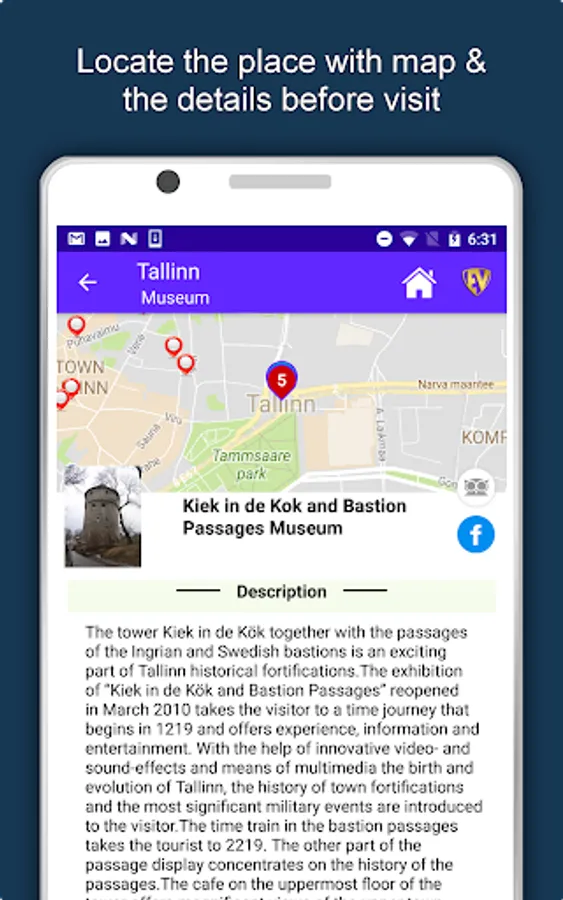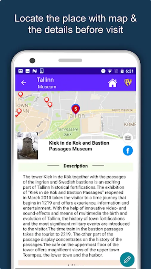Apart from this, Tallinn Travel & Explore guides you Why, When and How to visit various places in Tallinn with precise location on the detailed Map. There are two ways to explore this app - Category view and EduBank favorite places view. Pin your destinations and get the routes on the Map. Not only this, you can see exactly how the places look like with Street View integrated in this app. The app also has a feature to Rate and write Review/Experience regarding entity(s) through Login. Your Travel experience and rating will help the user community.