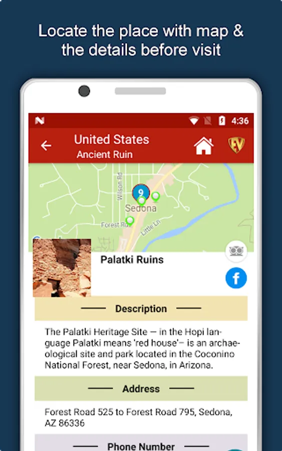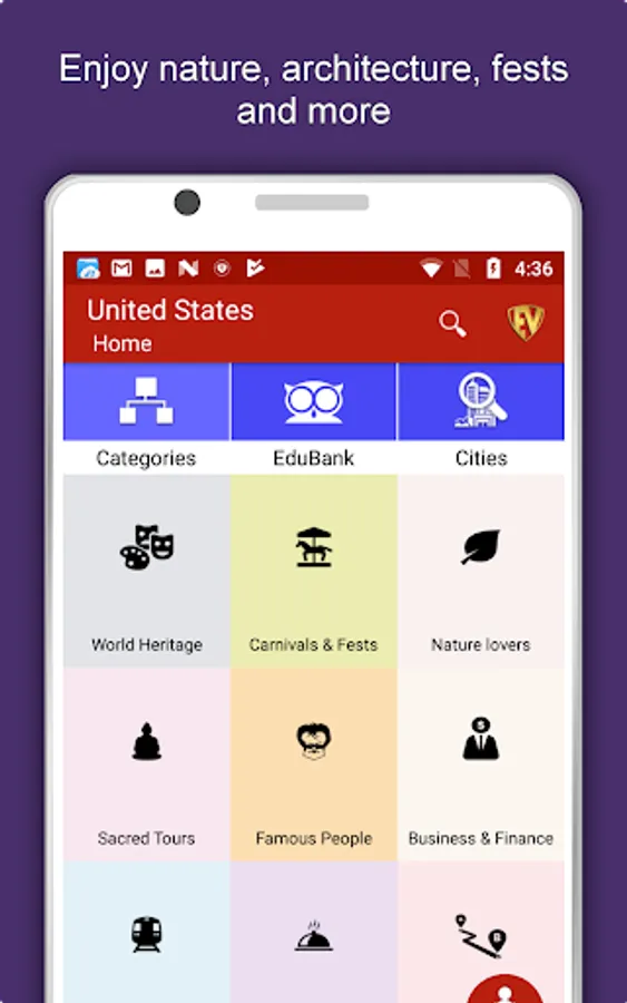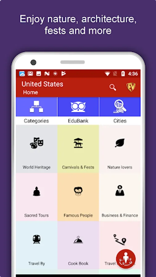 Apart from this, United States Travel & Explore guides you Why, When and How to visit various places in United States with precise location on the detailed Map. There are three ways to explore this app - Category view, City view and EduBank favorite places view. Pin your destinations and get the routes on the Map. Not only this, you can see exactly how the places look like with Street View integrated in this app. The app also has a feature to Rate and write Review/Experience regarding entity(s) through Login. Your Travel experience and rating will help the user community.